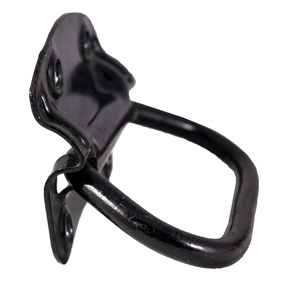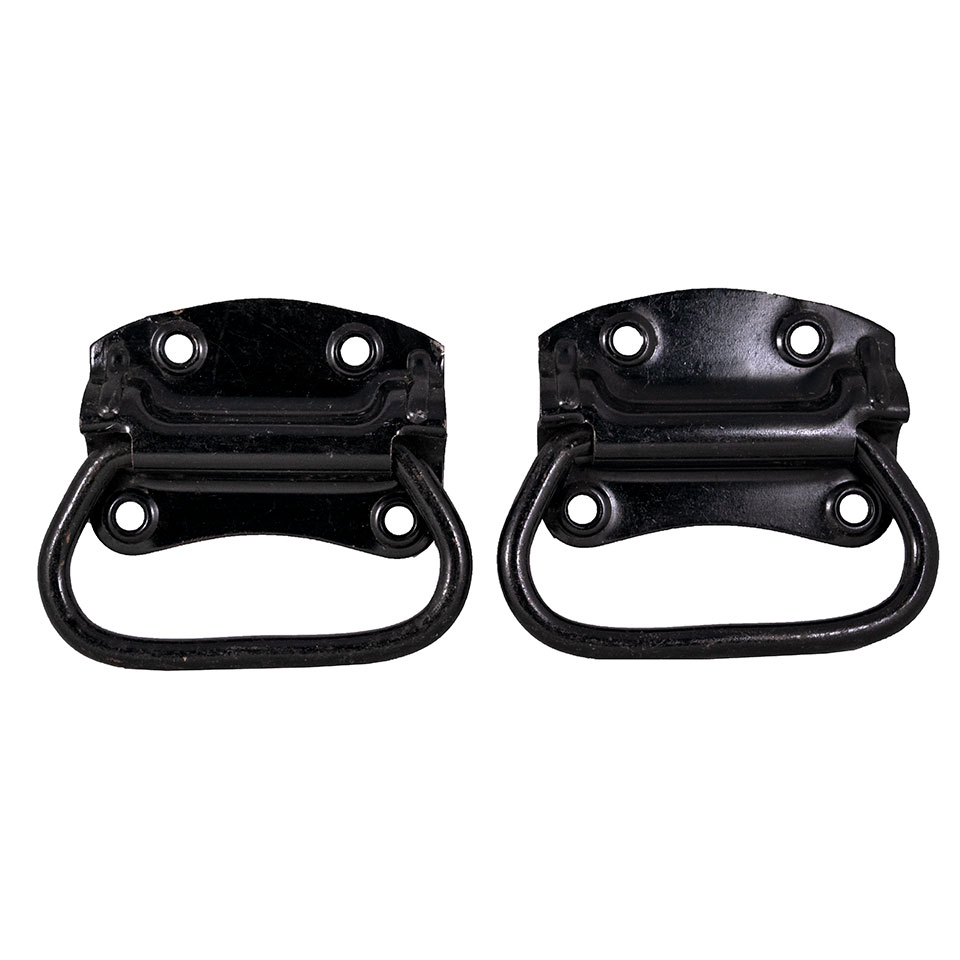 Pair of vintage Stanley steel heavy duty industrial trunk, toolbox, ammo box bail handles each measuring approximately 4 7/8" wide x 4 1/4" tall (overall). The mounting bracket alone measures 4 1/8" wide x 3" tall with screw holes measuring 2" on center (top of bracket) and 3" on center (bottom of bracket). Priced at $30/per pair.
