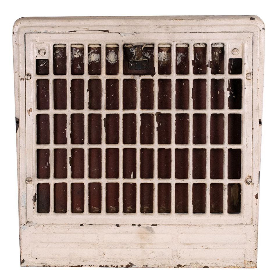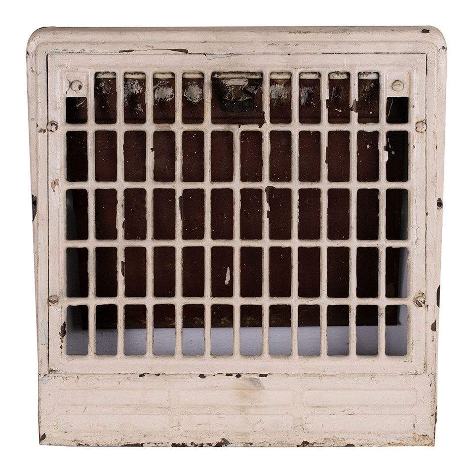 Vintage antique architectural salvage pressed metal wall heat grate with operable louver measuring approximately 10" x 12" (insert dimensions) and 14 1/8" x 14 1/4" (overall dimensions). Priced at $55/each. Due to the nature of architectural salvage - condition and color may vary.