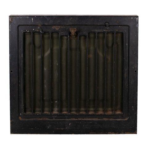 Vintage antique architectural salvage pressed metal wall heat grate with operable louver measuring approximately 10" x 12" (insert dimensions) and 15" wide x 14" tall with a 3" projection (overall dimensions). Priced at $55/each. Due to the nature of architectural salvage - condition and color may vary.