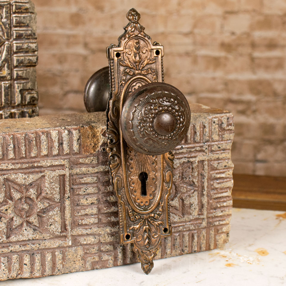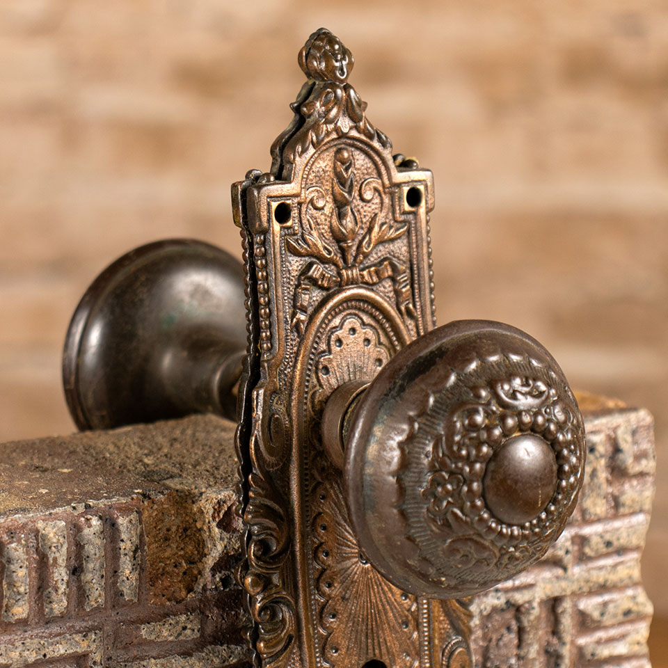 Antique architectural salvage Russell & Erwin Arabian pattern interior door hardware set circa 1897 including a pair of wrought steel 2 1/4" diam knobs with spindle and tapped set screws and a pair of approximately 2 1/2" wide x 8 3/4" tall cast iron backplates with brass collars. Sold in sets. Priced at $175 per set. Condition and patina may vary.
