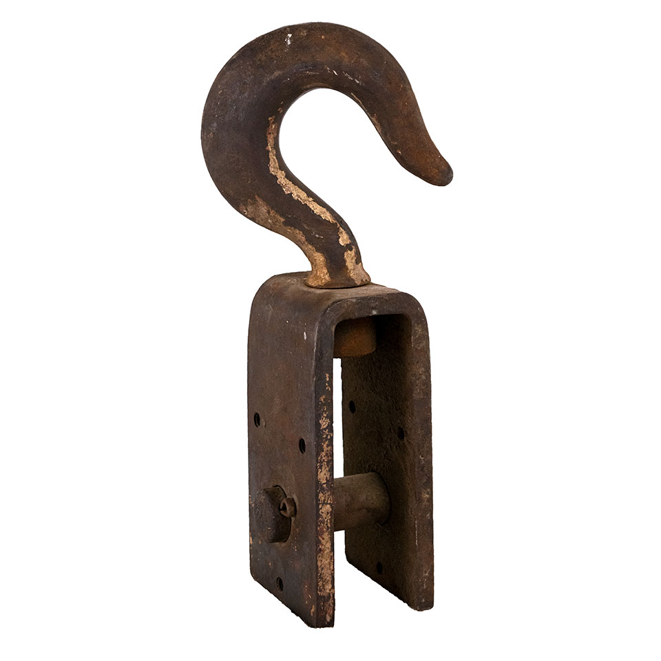 Vintage antique salvaged industrial iron hook measuring approximately 3" wide x 10 3/4" tall x 3 1/4" front to back.
