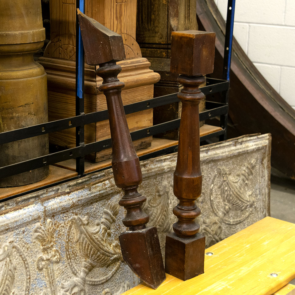 Vintage antique architectural salvage turned wood staircase baluster measuring approximately 2 1/2" square with a 15 1/4" tall turned middle section. Overall height varies. Priced at $15/each. Due to the nature of architectural salvage - condition and color may vary.