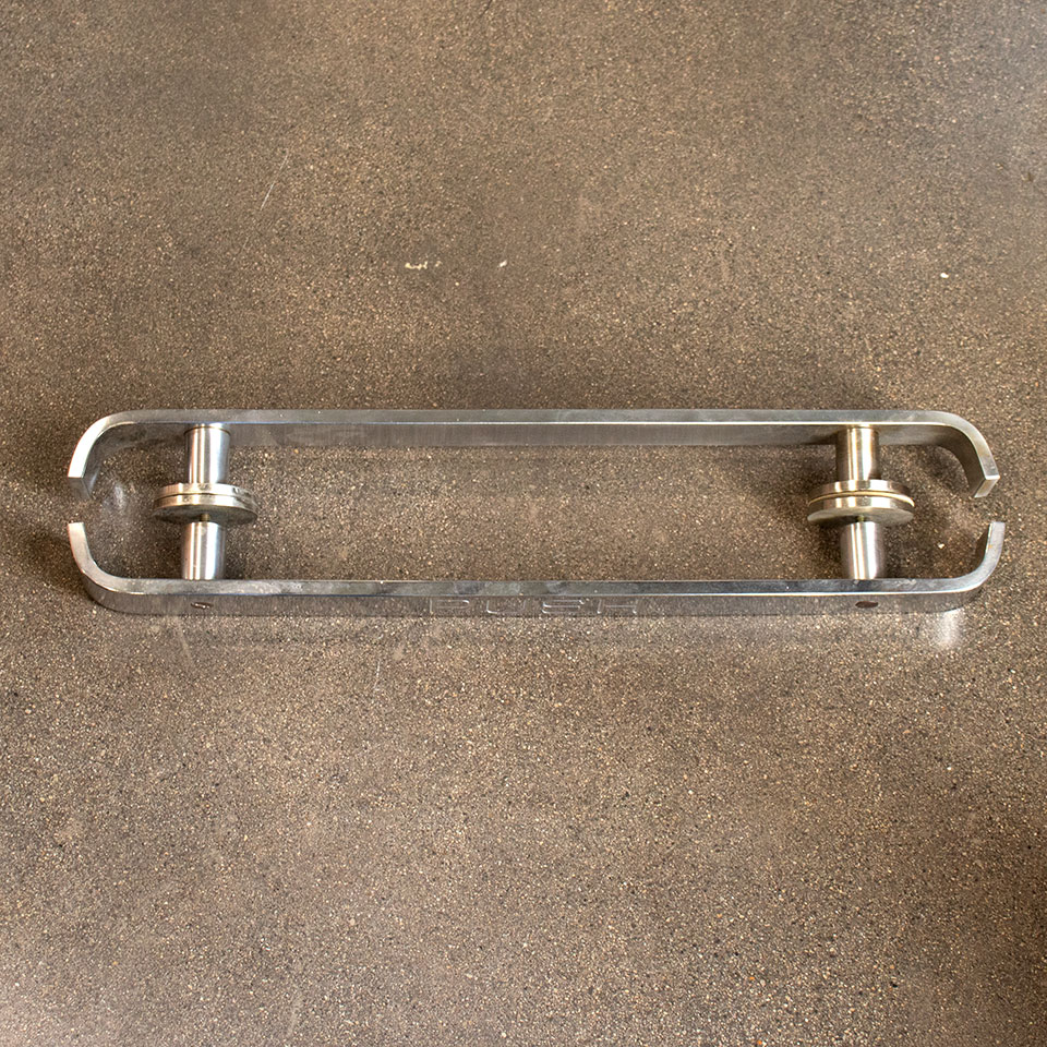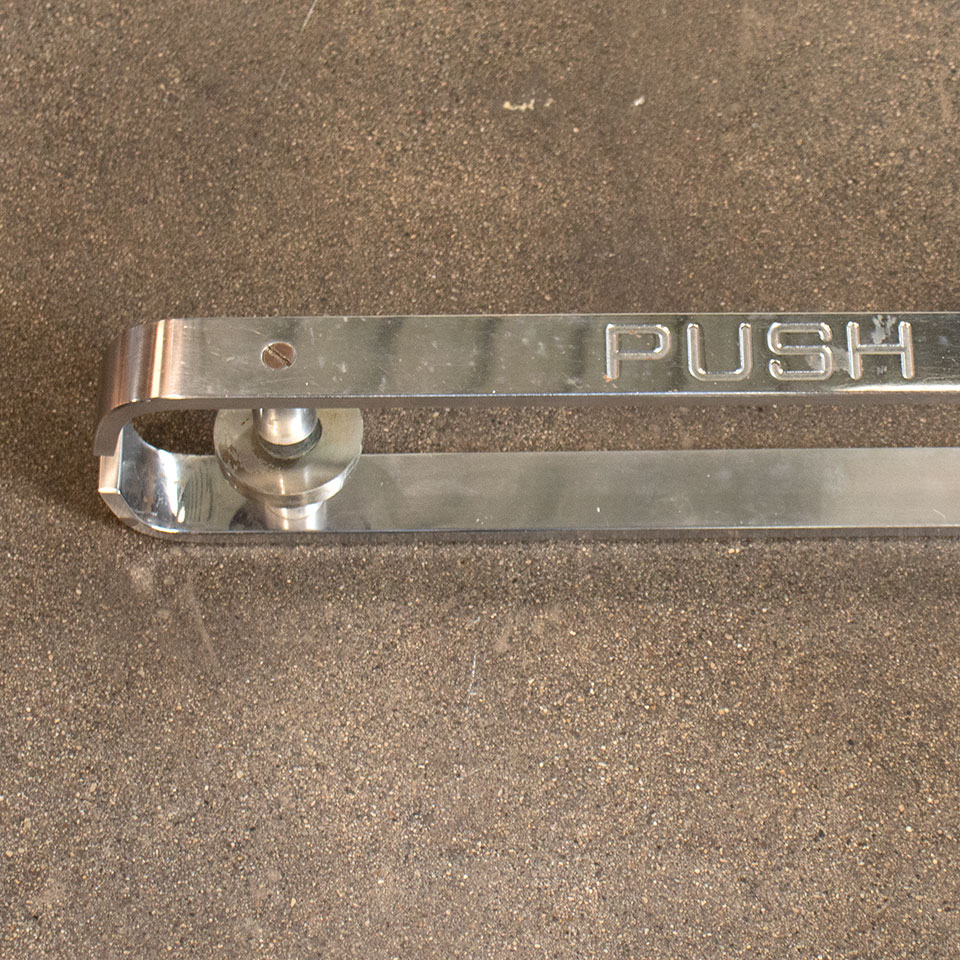 Pair of architectural salvage chrome PUSH and PULL entry door bar handles each measuring approximately 20 7/16" wide x 1 7/16" tall with a 2" projection. Each mounting rosette measures 2 3/8" in diameter. Priced at $225 for the pair.