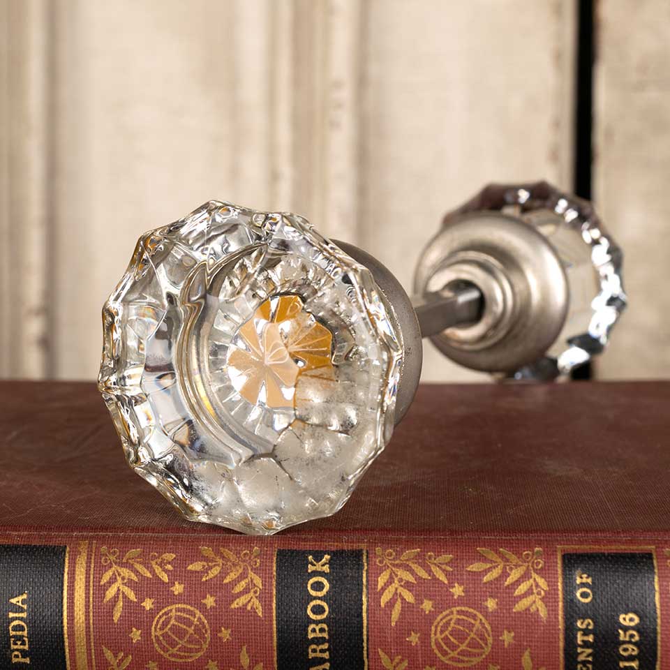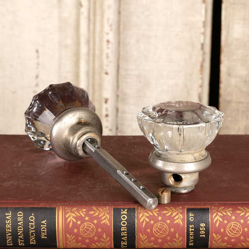 Pair of architectural salvage antique clear fluted glass and nickel plated brass doorknobs with a yellow painted center each measuring approx. 2" in diameter, with a 11/16" stem. Pair includes a 1/4" threaded spindle and set screws. See photos to evaluate condition. Priced at $50 for the pair.