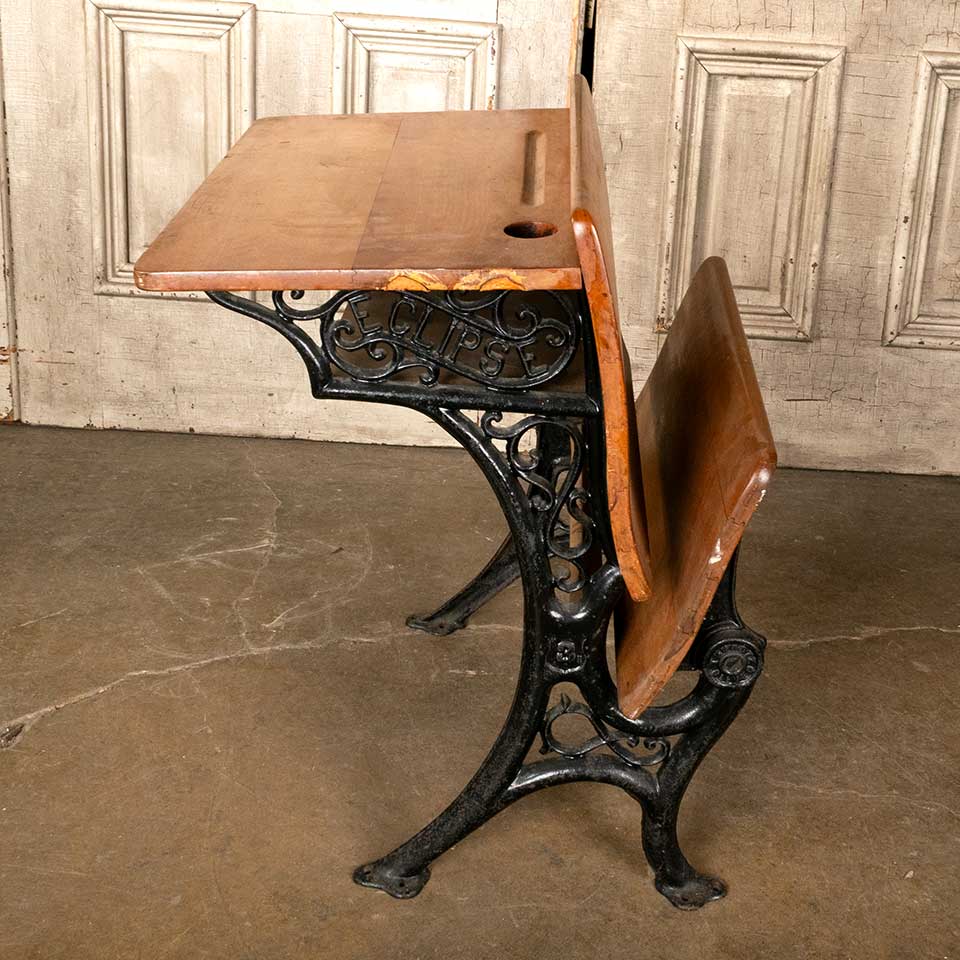 Architectural salvage antique ECLIPSE 3 wood and cast iron one room schoolhouse student school desk with fold up seat measuring approx. 22" wide x 27 3/4" tall x 28" front to back (when seat is down). See photos to evaluate condition.