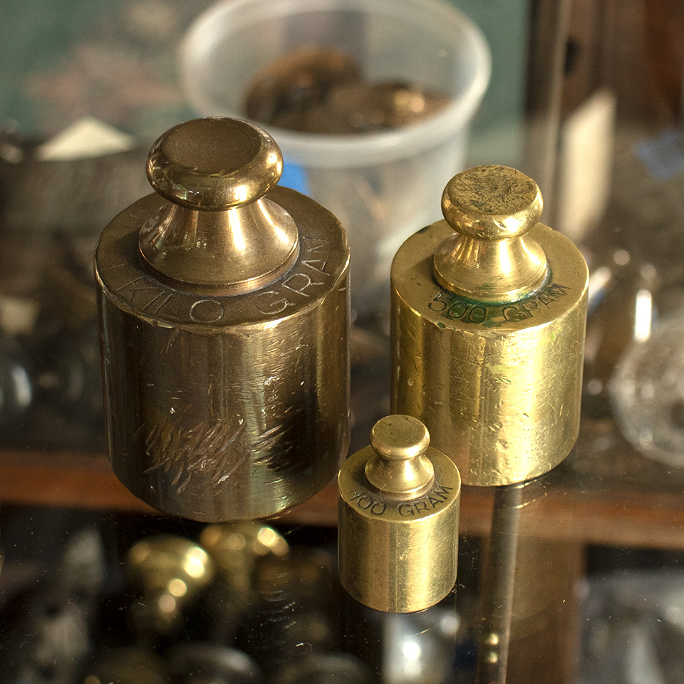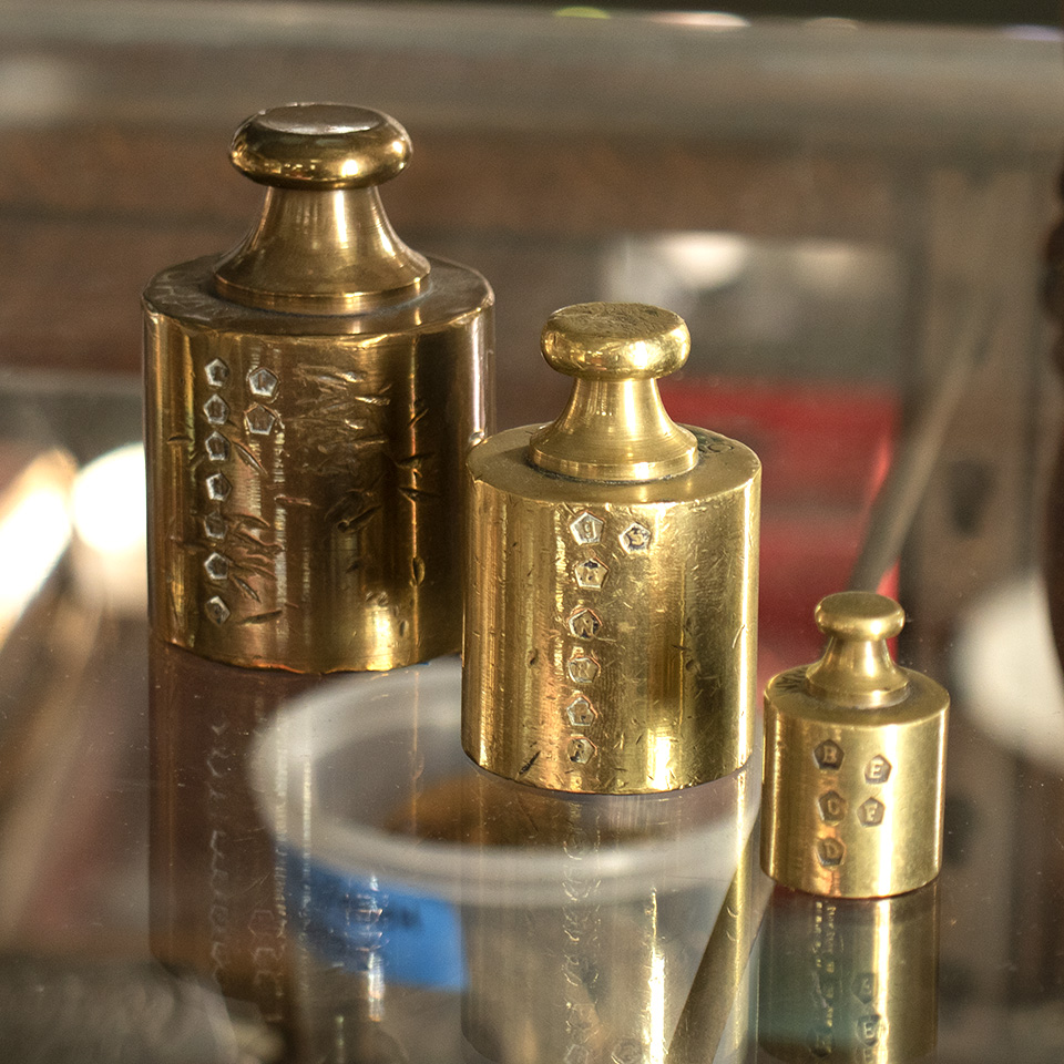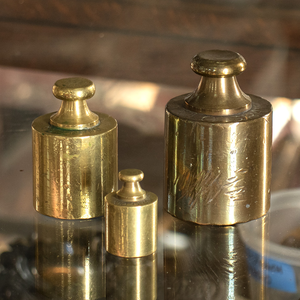 Set of 3 antique European brass apothecary scale weights including a 100 gram weight, a 500 gram weight, and a 1 kilogram weight. Priced at $75 for the set.