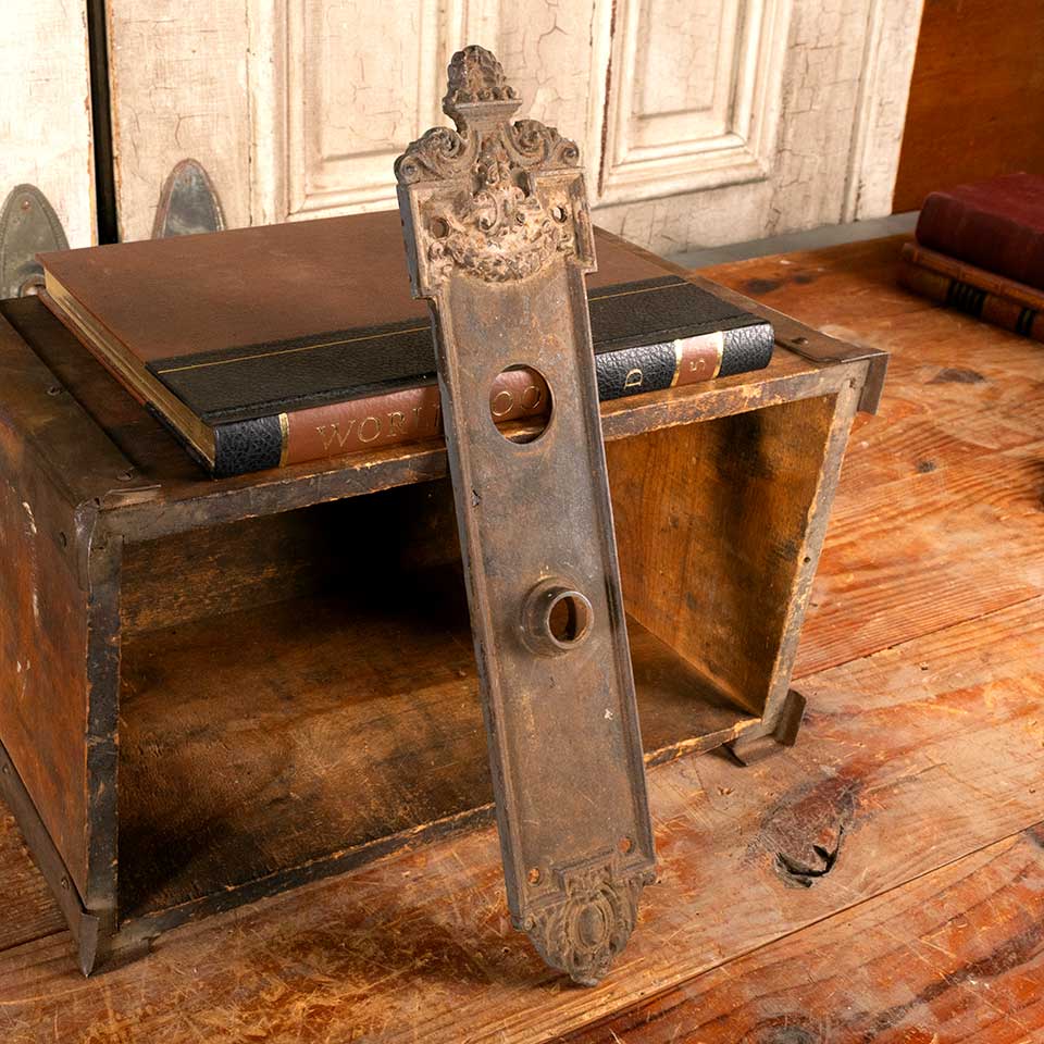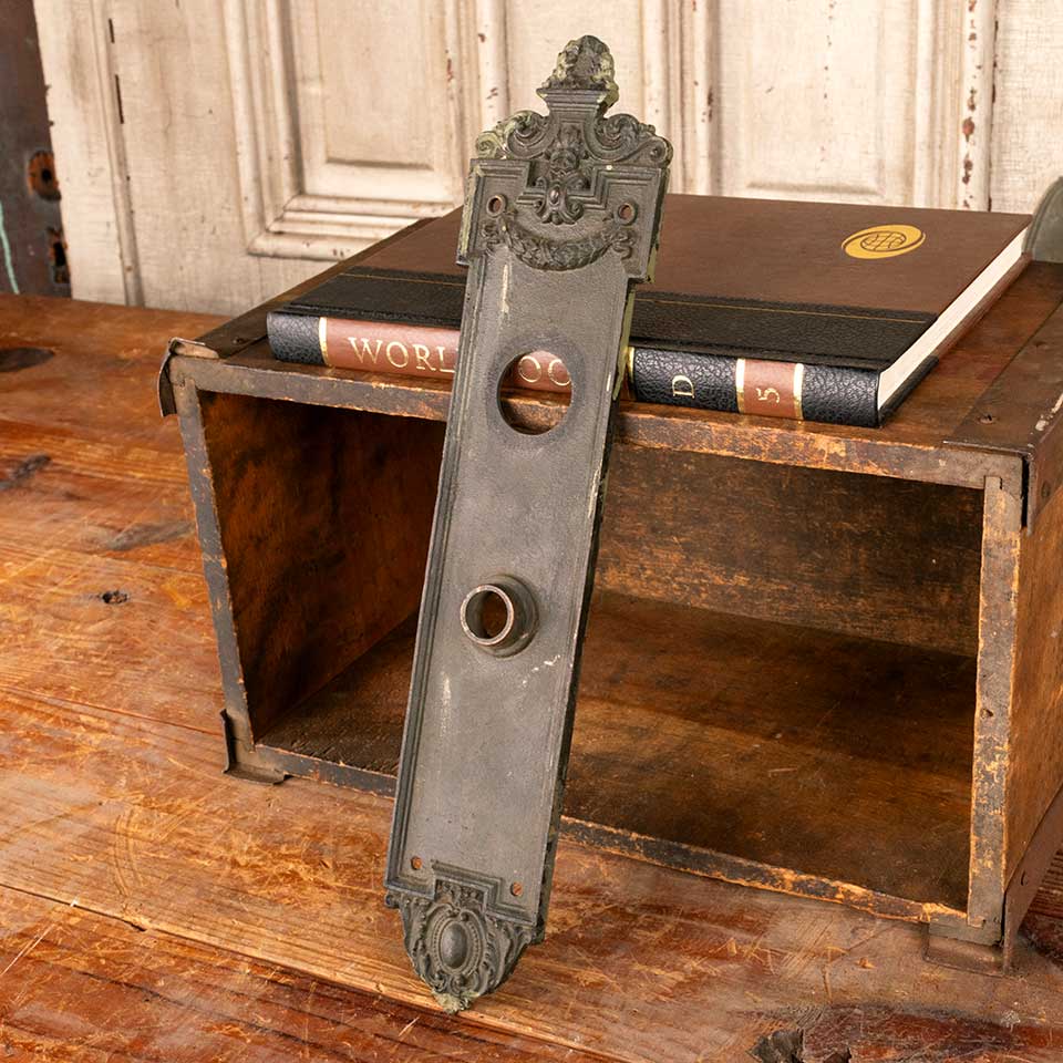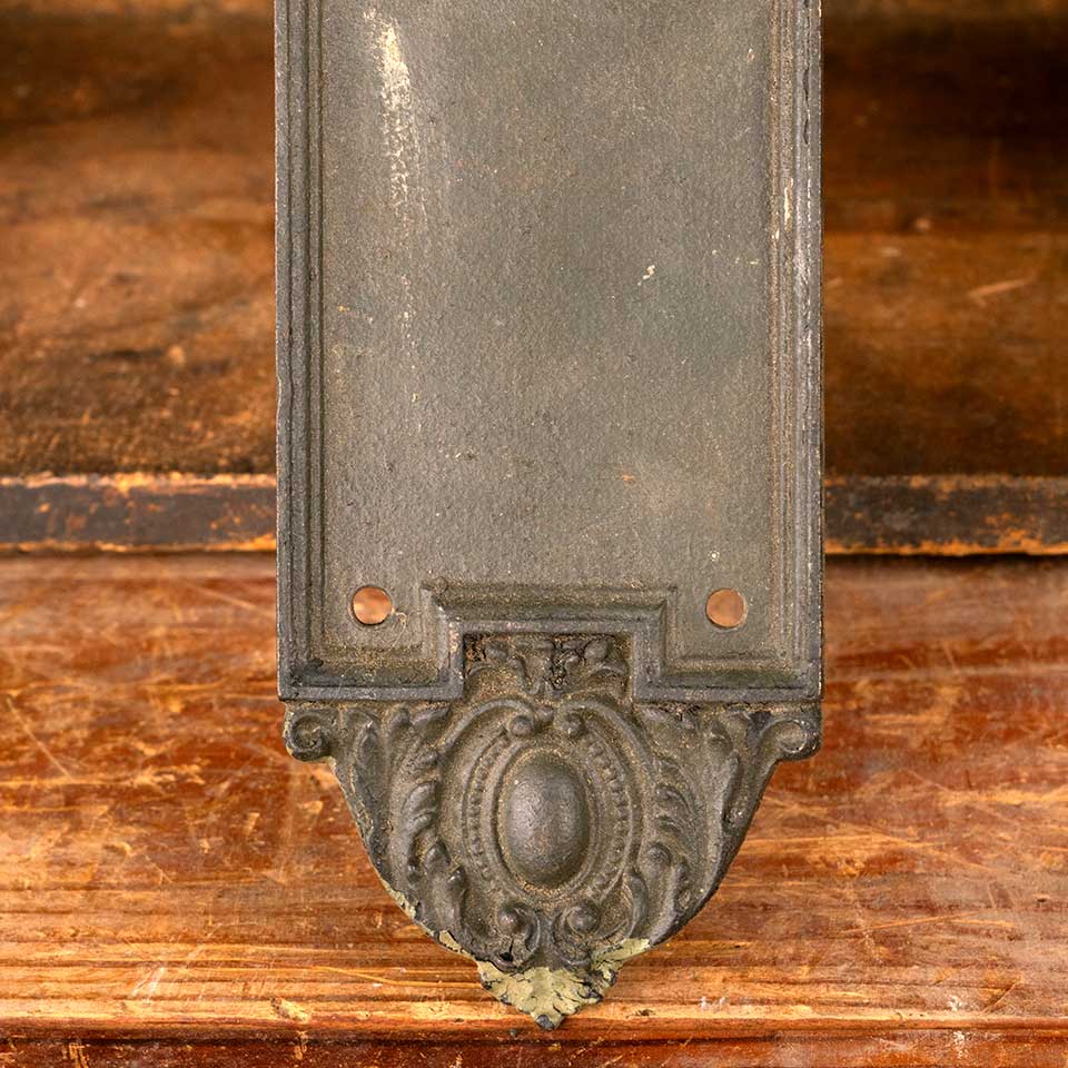 Architectural salvage antique cast iron Dartmoor entry doorknob backplate door hardware with deadbolt hole measuring approx. 3 1/8" wide x 14 3/8" tall x 1/4" thick with a 7/8" diameter collar. The collar and deadbolt hole measure 3 1/2" on centers. Color and condition vary, see photos to evaluate. Priced at $150/each.