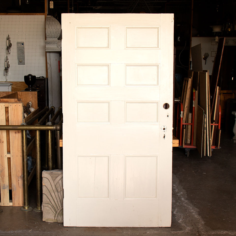 Vintage antique architectural salvage eight panel wood entry door measuring approximately 39 5/8" wide x 76 7/8" tall x 1 3/8" thick.