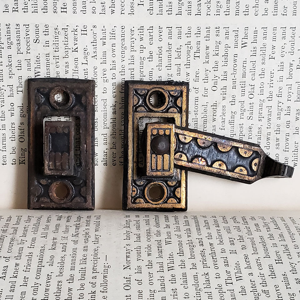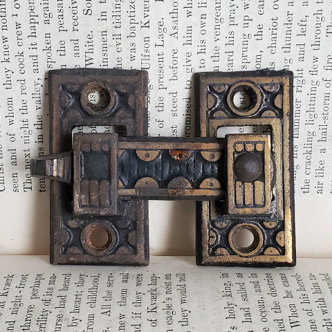 Antique architectural salvage ornate cast iron interior shutter or cabinet bar latch. Each piece measures approximately 1" wide x 1 7/8" tall and 2 3/8" wide when latched as shown. Priced at $30/each. Due to the nature of antique hardware, patina may vary.
