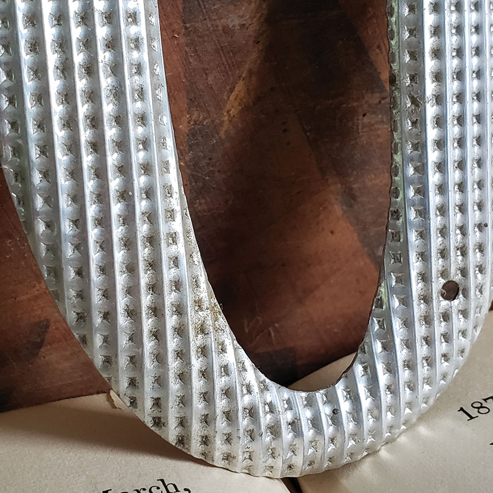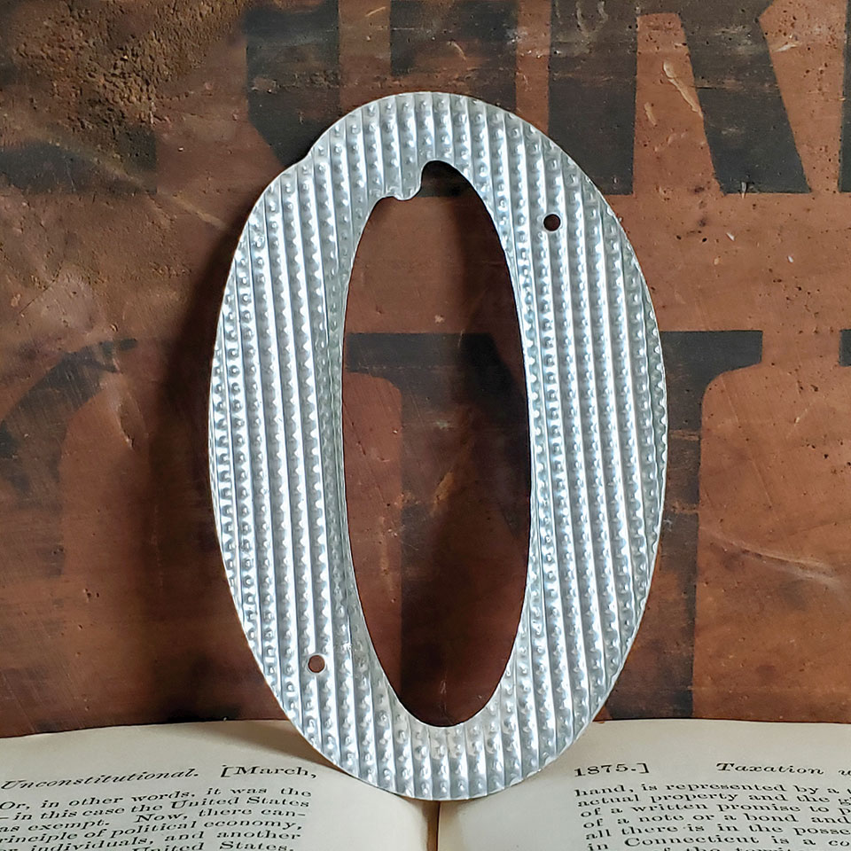 Vintage new old stock textured metal house number zero with silver finish measuring approximately 2 3/8" x 3 3/4".
