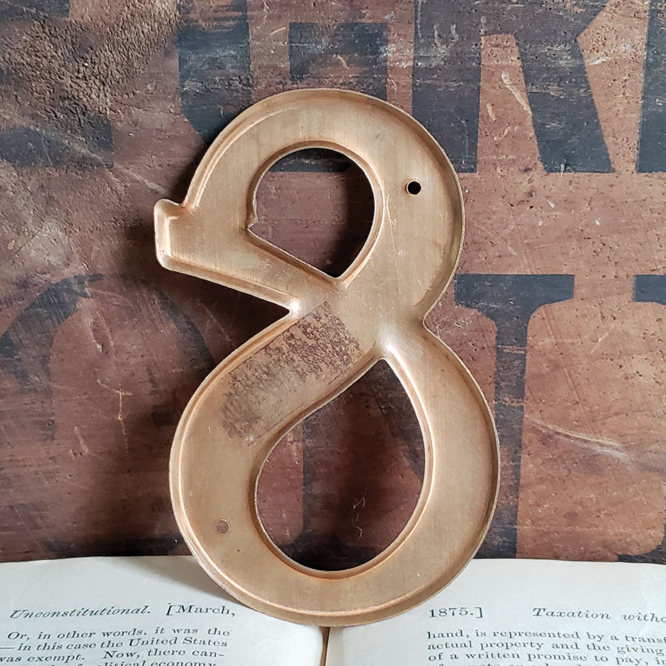 Vintage new old stock metal house number eight with copper finish measuring approximately 2 3/8" x 3 3/4". Sold individually. Priced at $8/each.