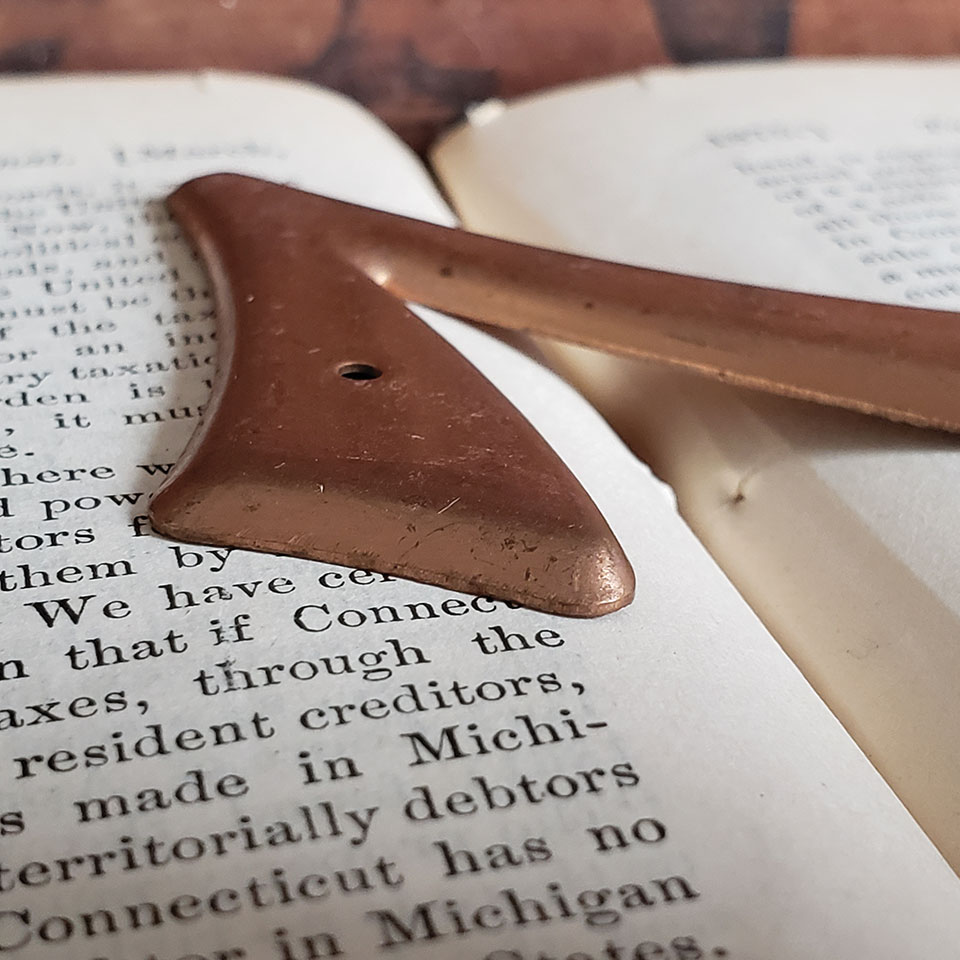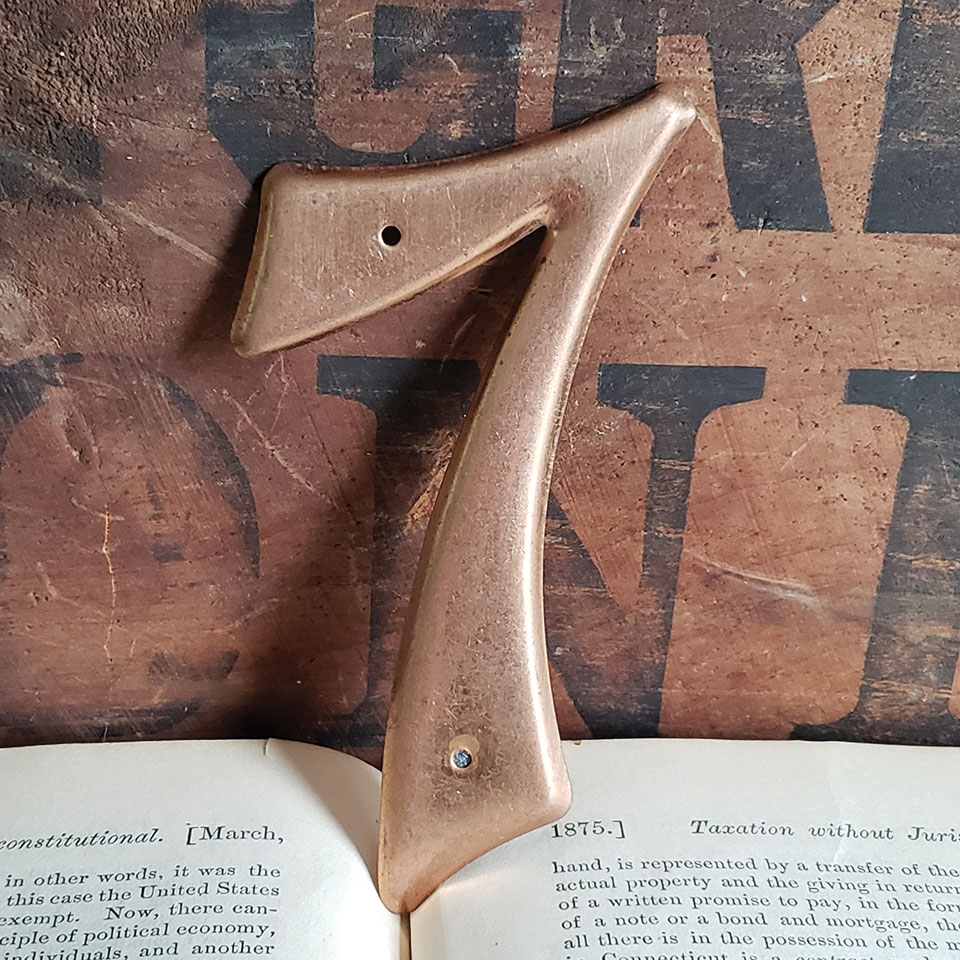 Vintage new old stock metal house number seven with copper finish measuring approximately 2 3/8" x 3 3/4".