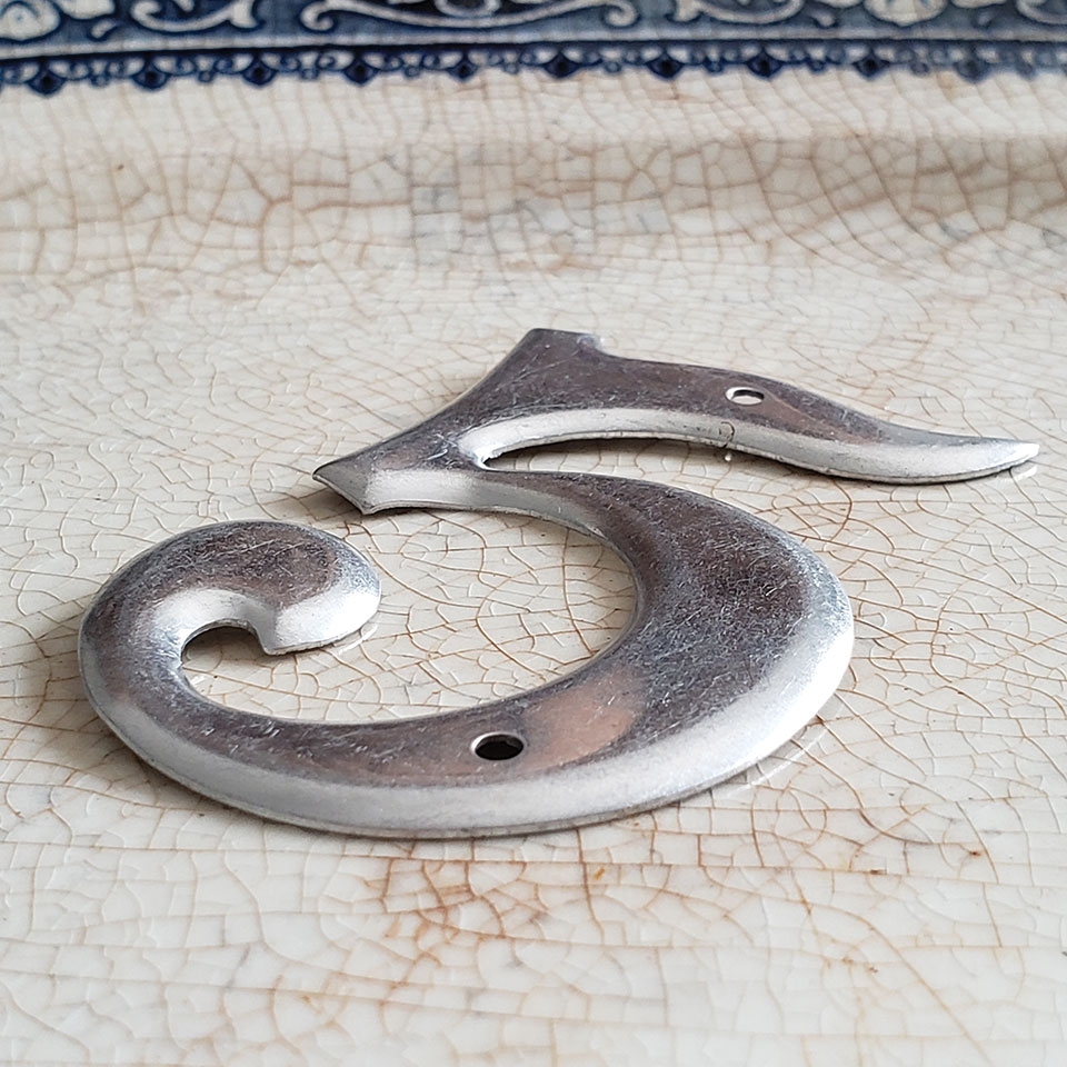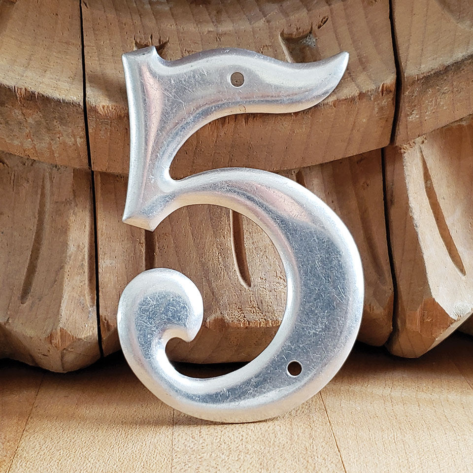 New old stock metal house number five with silver finish measuring approximately 2" x 3". Sold individually. Priced at $3/each.