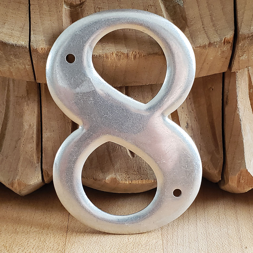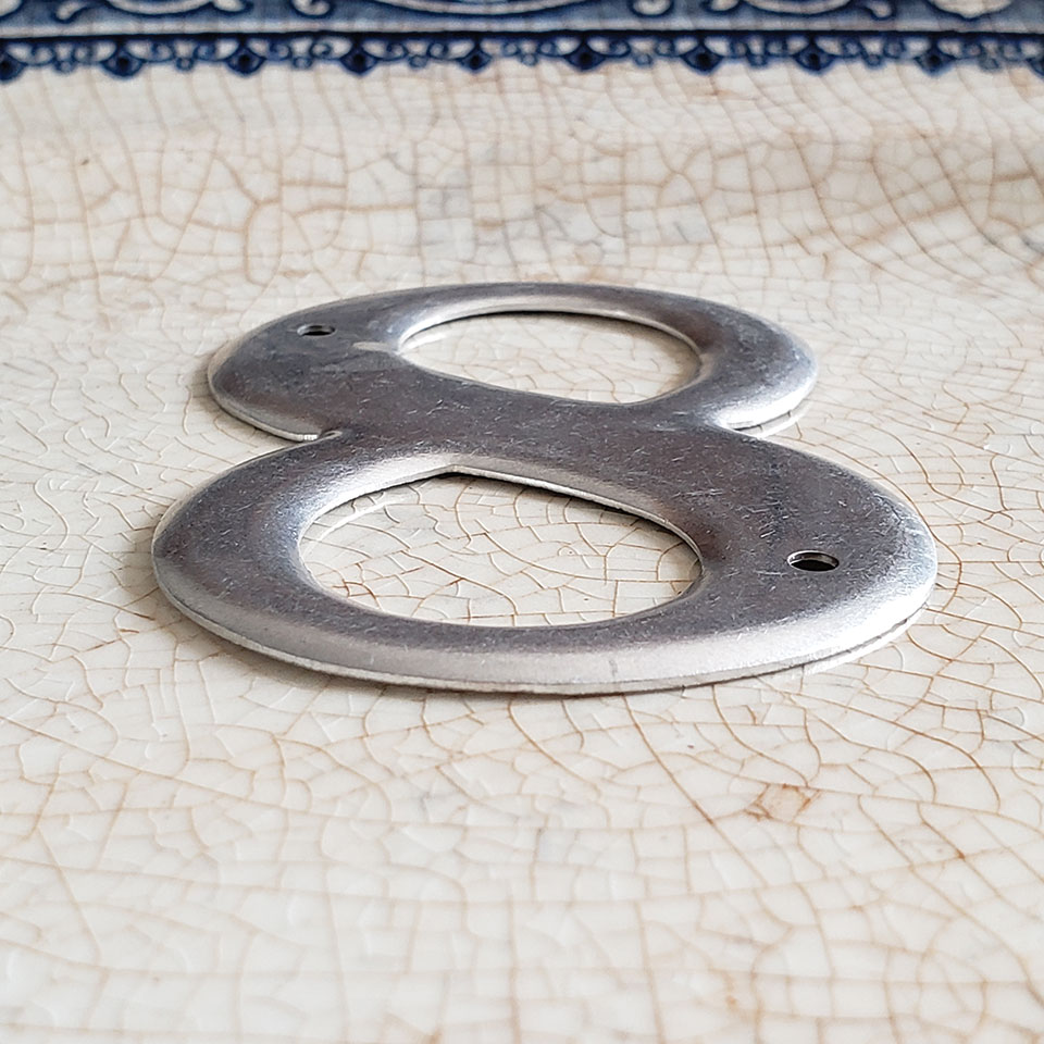 New old stock metal house number eight with silver finish measuring approximately 2" x 3". Sold individually. Priced at $3/each.