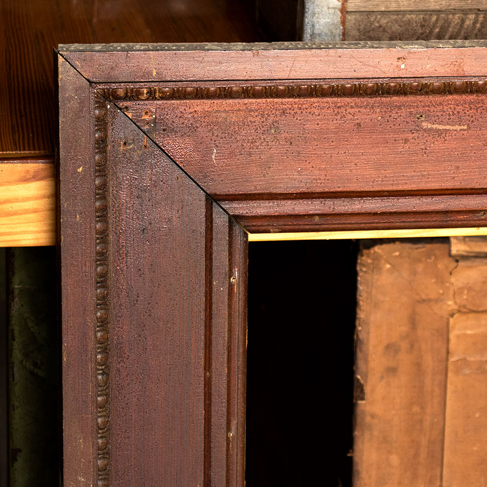 Large vintage/antique architectural salvage wood frame salvaged from a historic building in Shelby County, Ohio. This frame measures approximately 35 1/2" square x 1 3/4" thick with an opening measuring approximately 24 1/4" square.