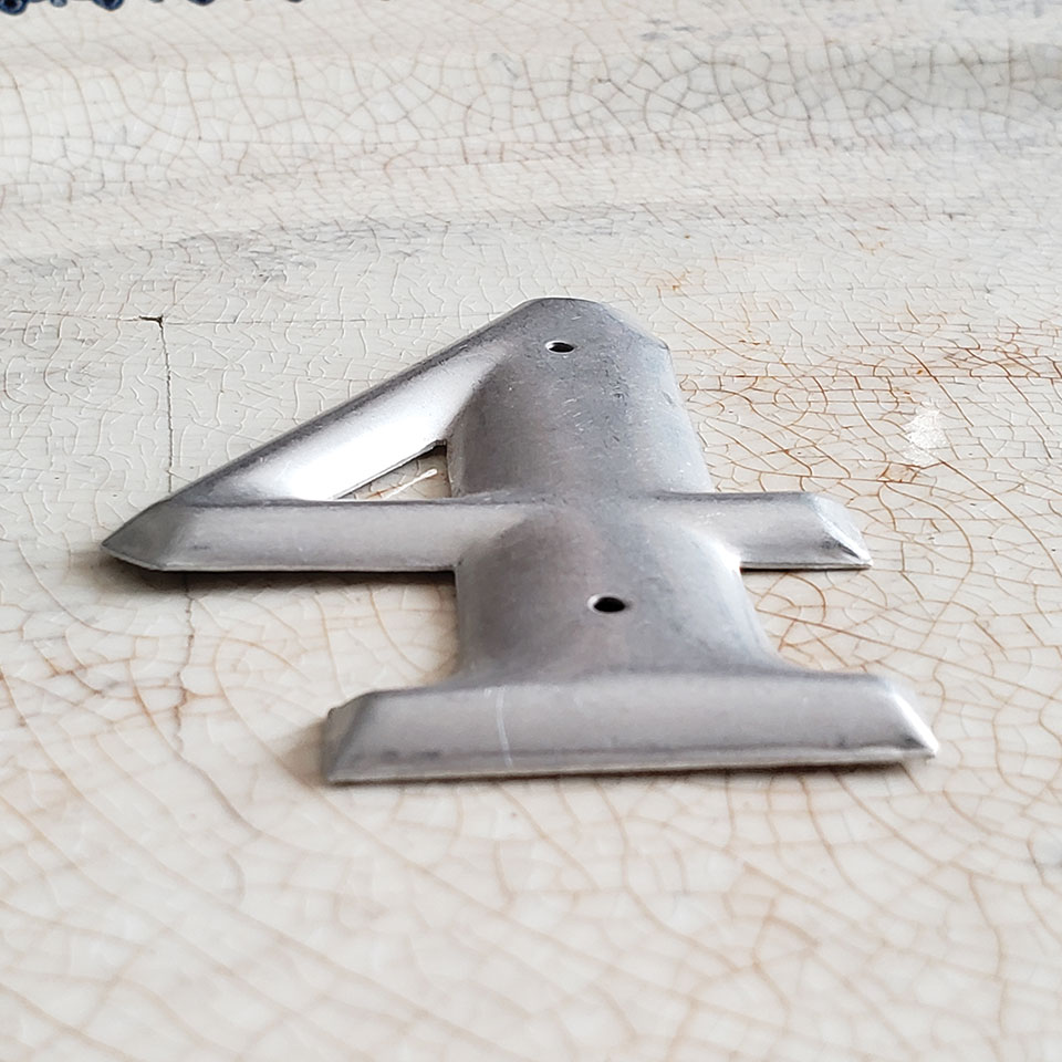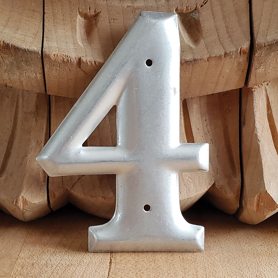 New old stock metal house number four with silver finish measuring approximately 2" x 3".