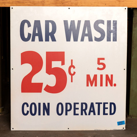 Architectural salvage double sided metal CAR WASH 25 cent 5 MIN. COIN OPERATED sign measuring approx. 28" wide x 30" tall. See photos to evaluate condition.