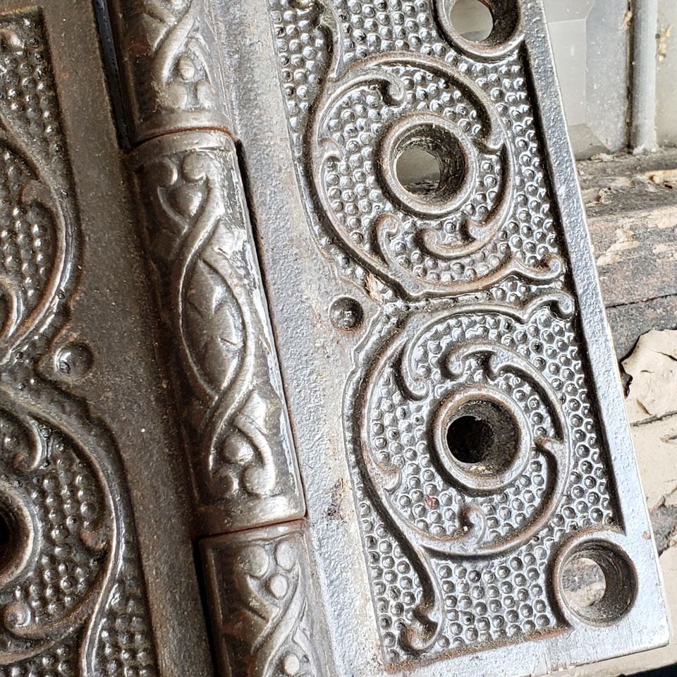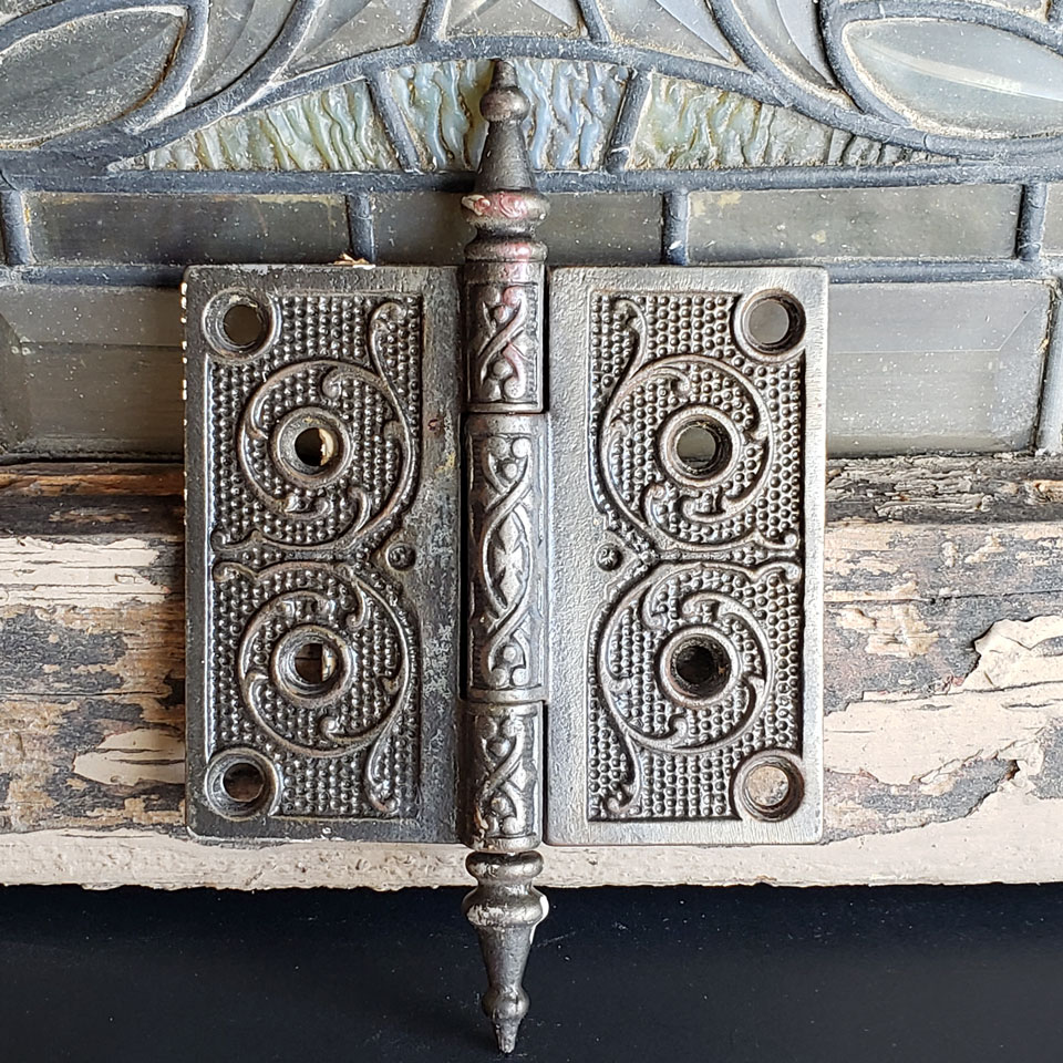 Antique architectural salvage ornate cast iron steeple finial door hinge hardware measuring approximately 4 1/2" wide x 4" tall (6 3/4" tall including finials). See photos to evaluate condition.