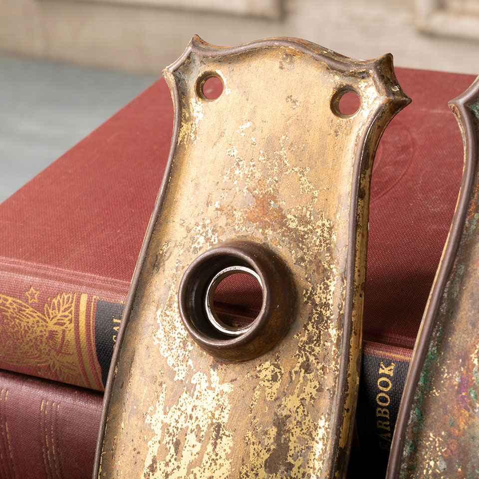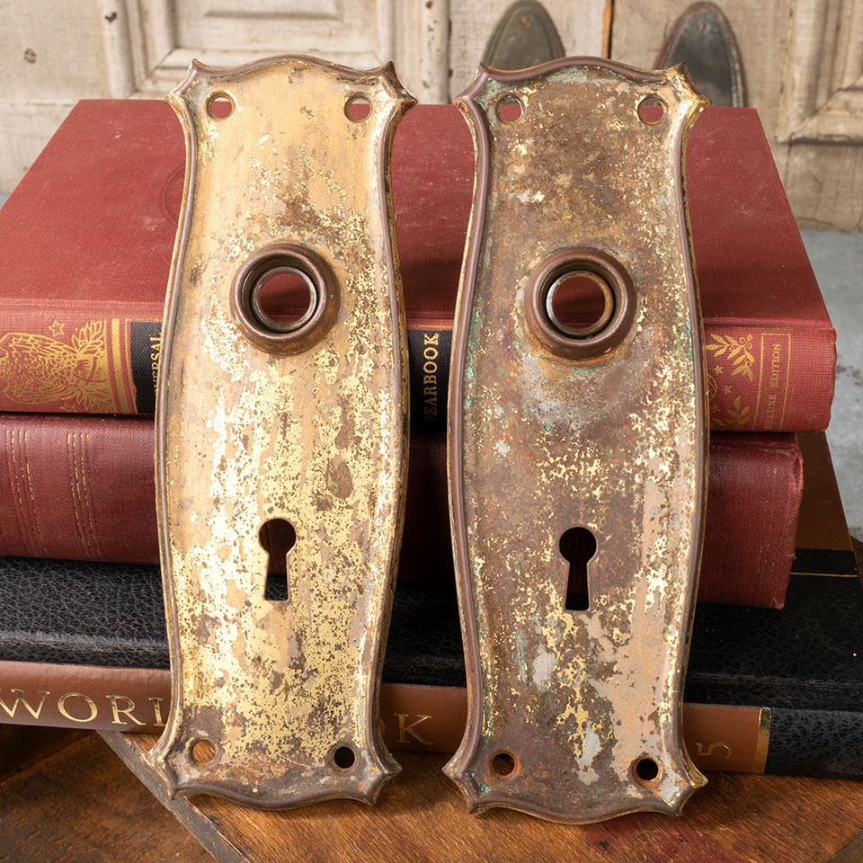 Pair of antique architectural salvage steel doorknob backplates each measuring approximately 2 3/8" wide x 7" tall with 11/16" diameter collars. Priced at $40 for the pair.