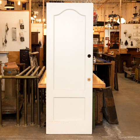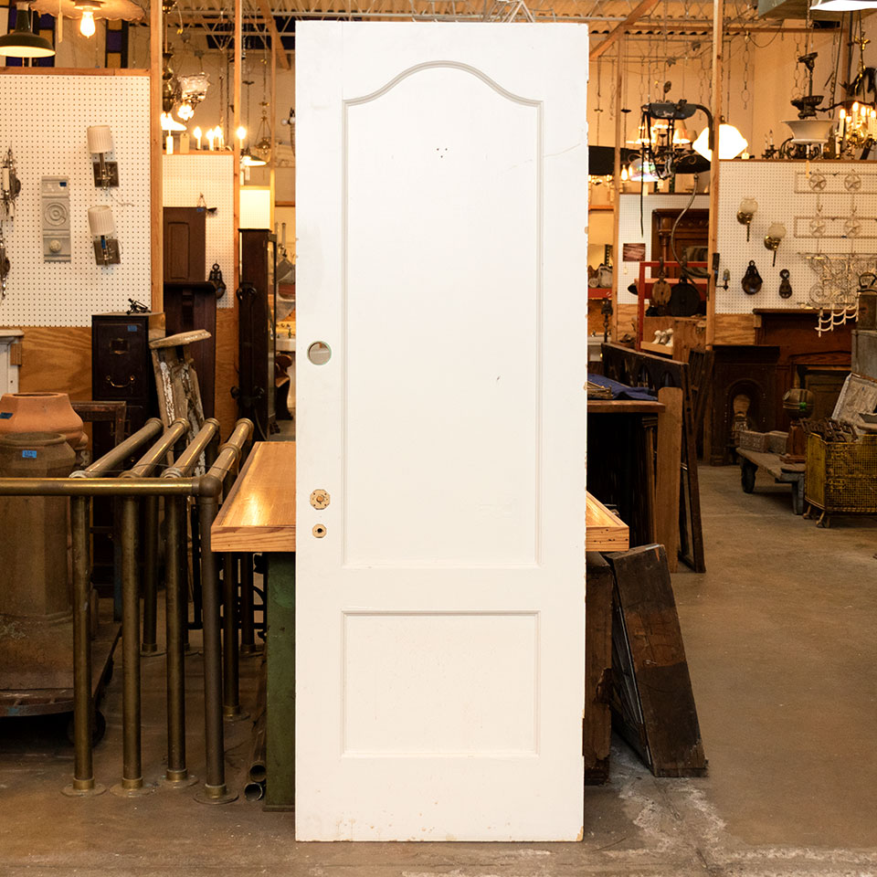 Vintage antique architectural salvage painted wood two panel interior door measuring approximately 29 3/4" wide x 83 3/4" tall x 1 3/4" thick. #archedtop