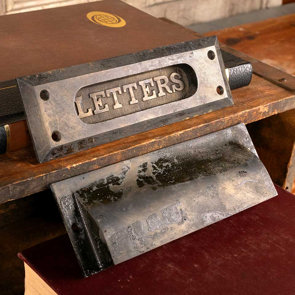 Architectural salvage cast iron entry door mail slot hardware with hinged LETTERS flap measuring approx. 7" wide x 2 1/4" tall x 1/4" front to back. The mail slot measures approx. 4 3/8" wide x 1 1/8" tall. The interior mail slot hood measures approx. 7" wide 2 1/2" tall x 3/4" front to back with a 5 7/8" wide opening. Color and condition vary, see photos to evaluate. Priced at $150/set.