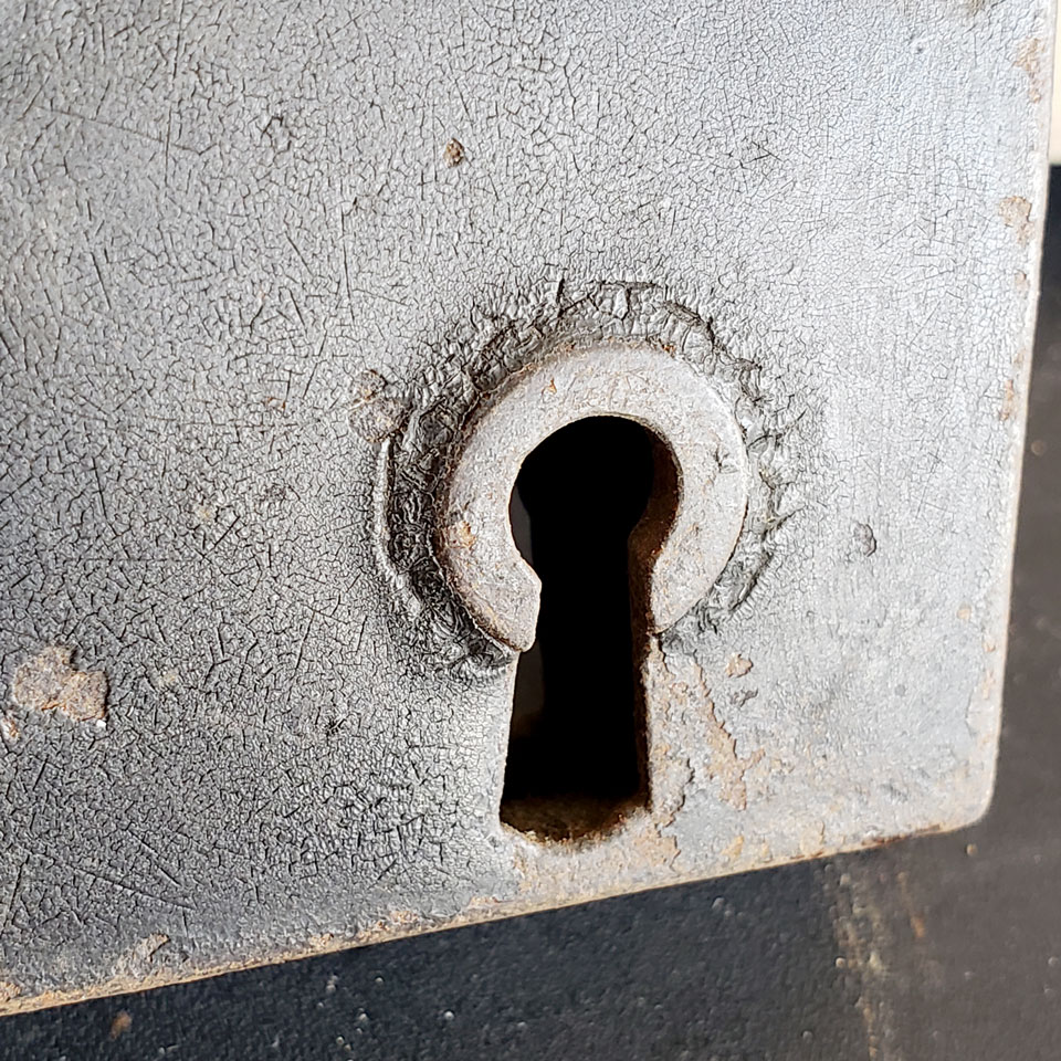 Large antique architectural salvage operable cast iron surface mount tapered edge rim lock door latch hardware with catch, manual bolt with brass switch, and separate key-operated dead bolt. This lock measures approximately 4 3/8" wide including the catch x 4 7/8" tall with a 5/8" projection. Key not included. Awesome original patina.