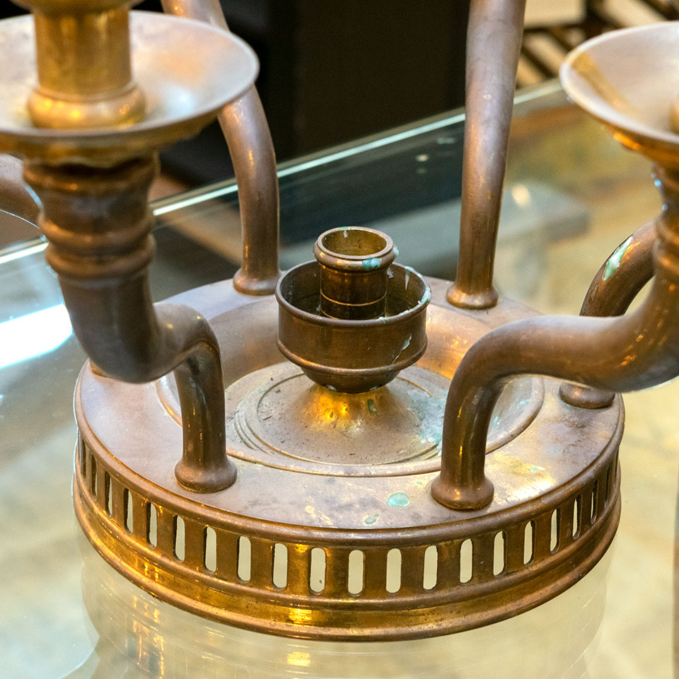 Seven candle round brass candelabra measuring approximately 19" in diameter x 10 1/2" tall with a 12 1/2" with an 8 1/2" diameter base.