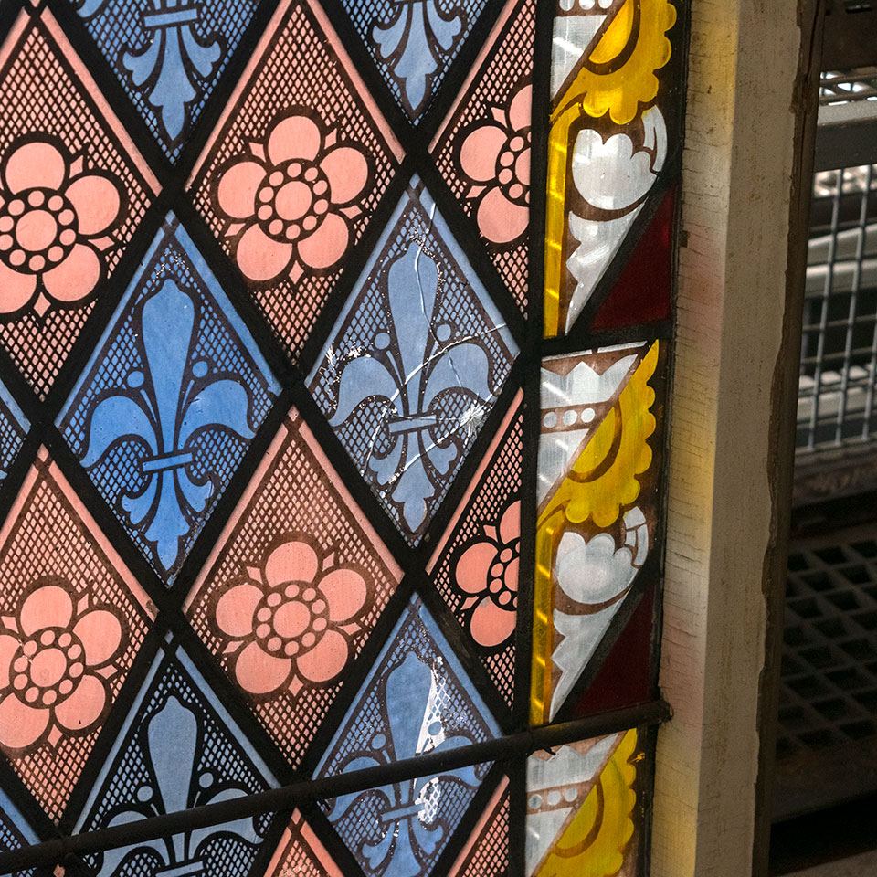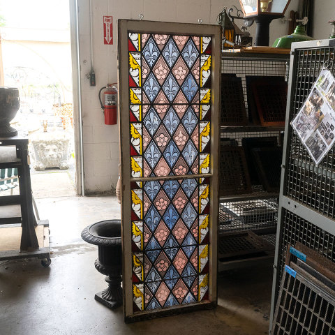 Antique architectural salvage stained glass panel with hand painted design and wood window frame measuring approximately 23 3/4" wide x 67 3/4" tall x 1 5/8" thick. There are two cracked panes of glass. Please see photos to evaluate condition.