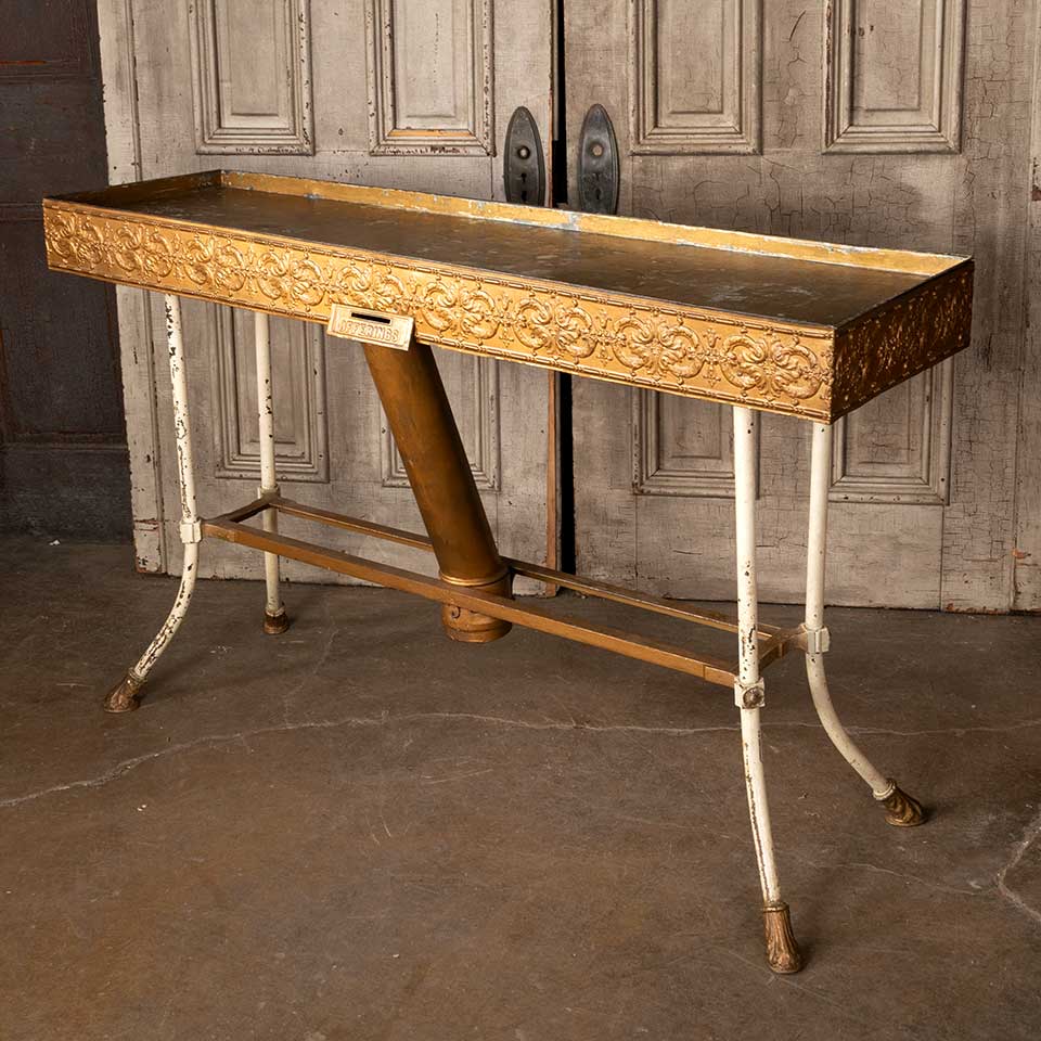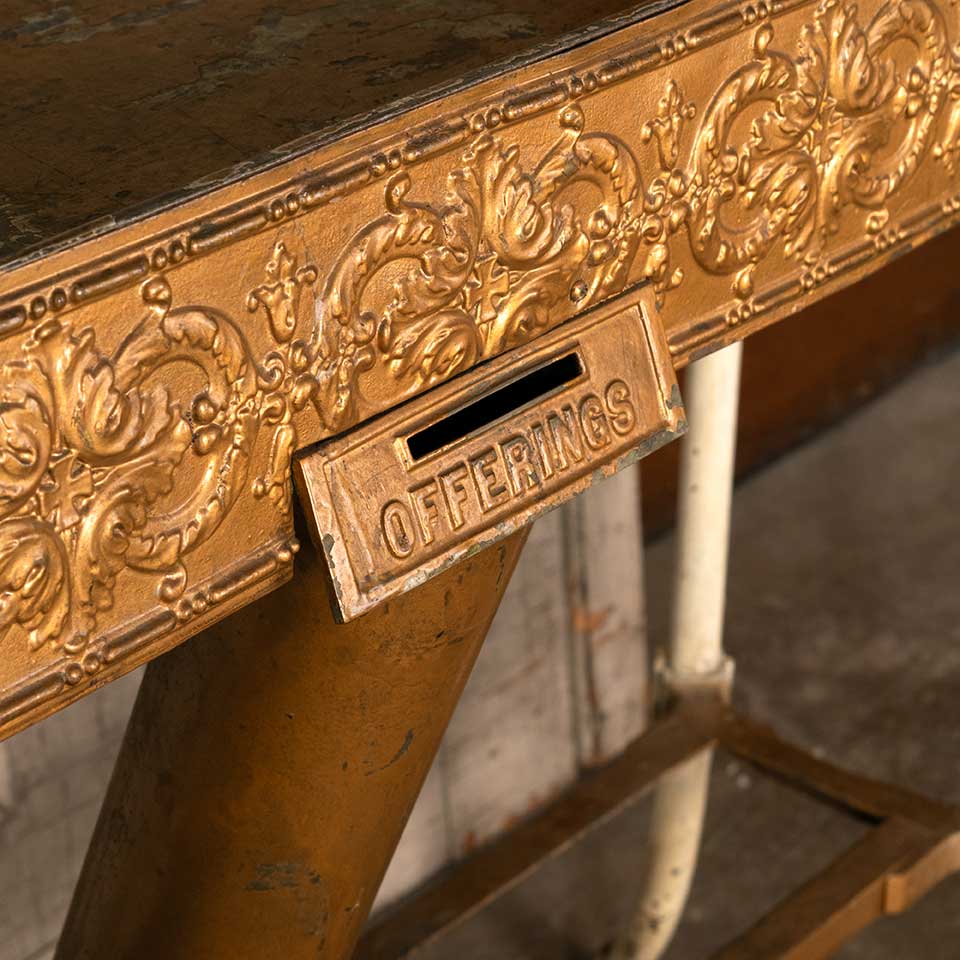 Architectural salvage antique wood and metal Catholic Church votive candle table with OFFERING slot measuring approx. 57 1/4" wide x 36" tall x 16" front to back. See photos to evaluate condition.