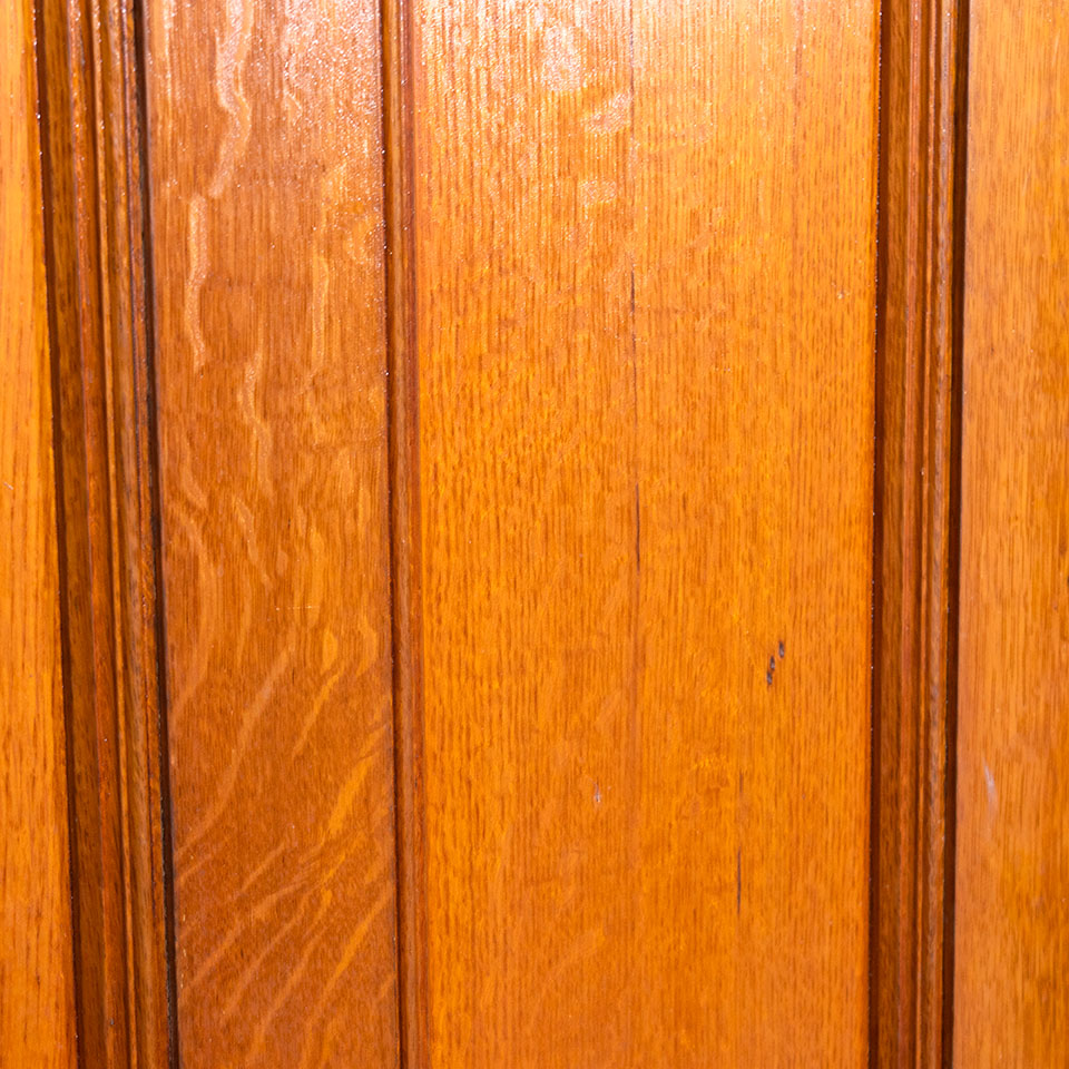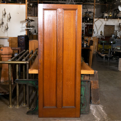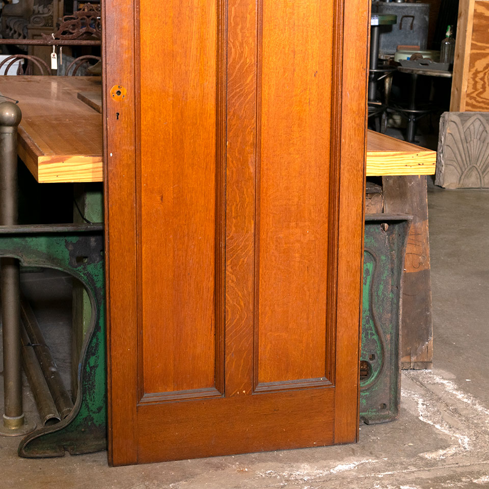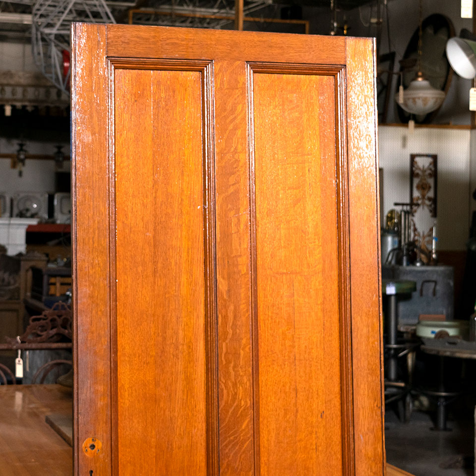 Vintage antique architectural salvage two panel oak door measuring approximately 28 1/8" wide x 74 3/8" tall x 3/4" thick (1 1/2" thick on hinged side). This door was salvaged from a church and was set into a wall of paneling.