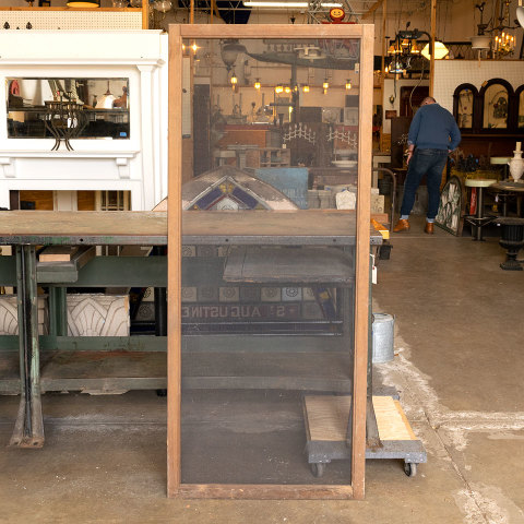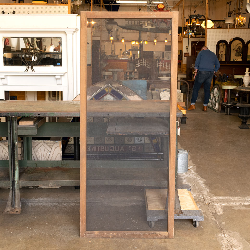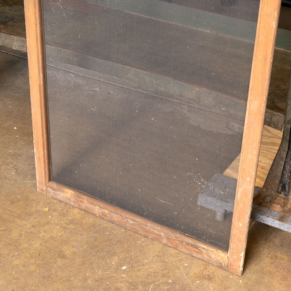 Vintage antique architectural salvage wood screen door panel measuring approximately 29" wide x 68 3/8" tall x 1 1/8" thick. The insert dimensions are approximately 28 1/4" wide x 67 3/4" tall.