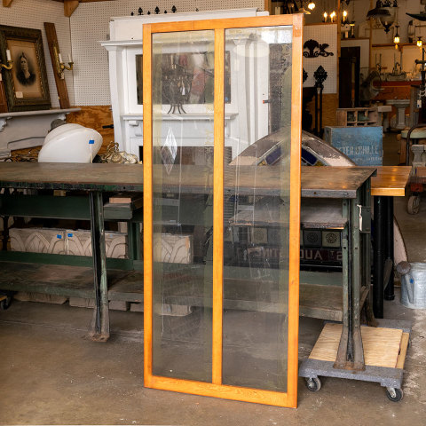 Architectural salvage wood and glass panel measuring approximately 29 7/8" wide x 68 1/4" tall x 3/4" thick. The backside of the panel is rabbeted out and the interior dimensions are approximately 29" wide x 67 3/8" tall.