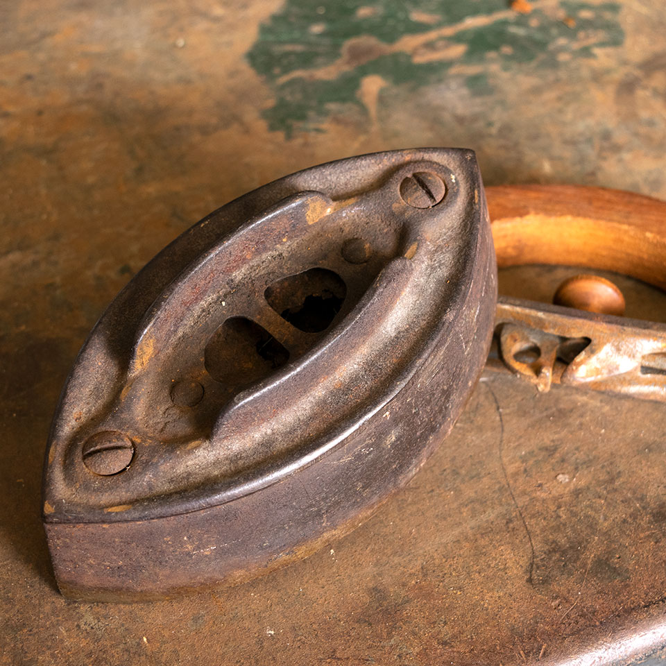 Vintage antique cast iron sad iron with wood handle measuring approximately 3 3/8" wide x 4 3/4" tall x 6 1/2" front to back.
