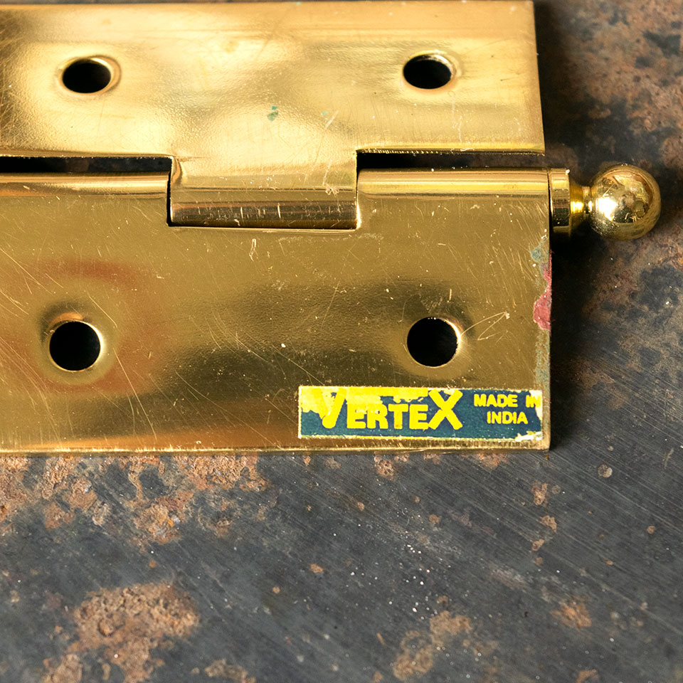 Pair of architectural salvage Vertex brand solid brass ball finial tip furniture cabinet door butt hinges each measuring approximately 3" tall. Sold in pairs. Priced at $15 per pair. Condition may vary.
