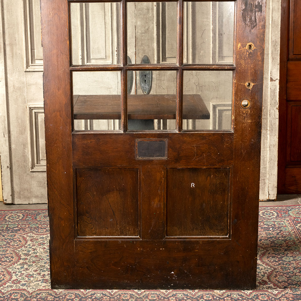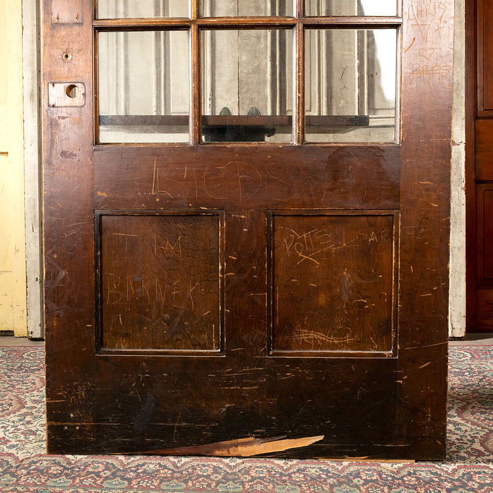 Antique architectural salvage paneled wood and glass classroom door with divided twelve lite window measuring approximately 39" wide x 81 7/8" tall x 1 3/4" thick. This door was reclaimed from Grandview Heights High School in Columbus, Ohio prior to interior renovations. See photos to evaluate condition.