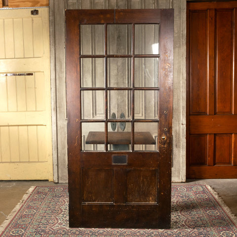 Antique architectural salvage paneled wood and glass classroom door with divided twelve lite window measuring approximately 39" wide x 81 1/2" tall x 1 3/4" thick. This door was reclaimed from Grandview Heights High School in Columbus, Ohio prior to interior renovations. See photos to evaluate condition.