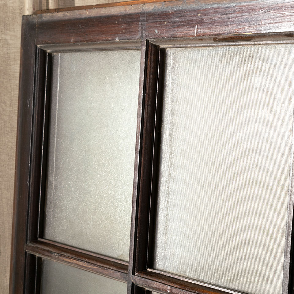 Antique architectural salvage divided lite interior pine wood entry door transom window with 12 privacy glass panes measuring approximately 63 1/8" long x 27 1/2" tall x 1 3/4" thick. This window was reclaimed from Grandview Heights (Ohio) High School prior to the building's renovation.