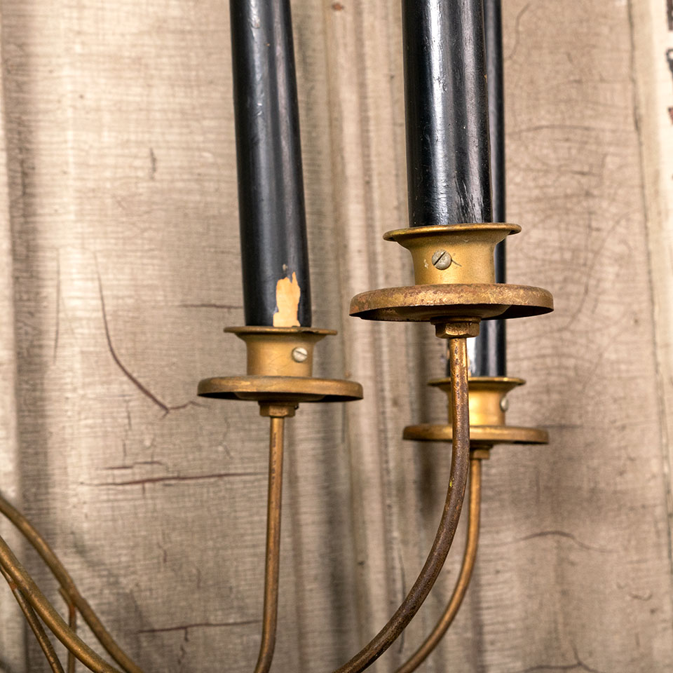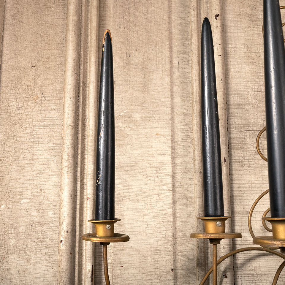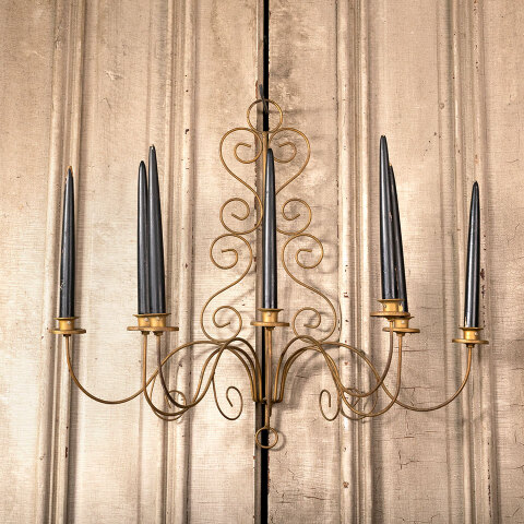 Decorative metal wall hung candelabra with 7 wood candles measuring approx. 27" wide x 23" tall x 12 1/2" front to back.