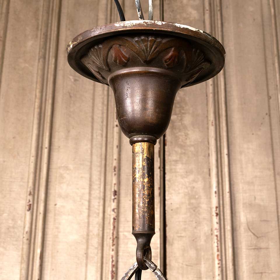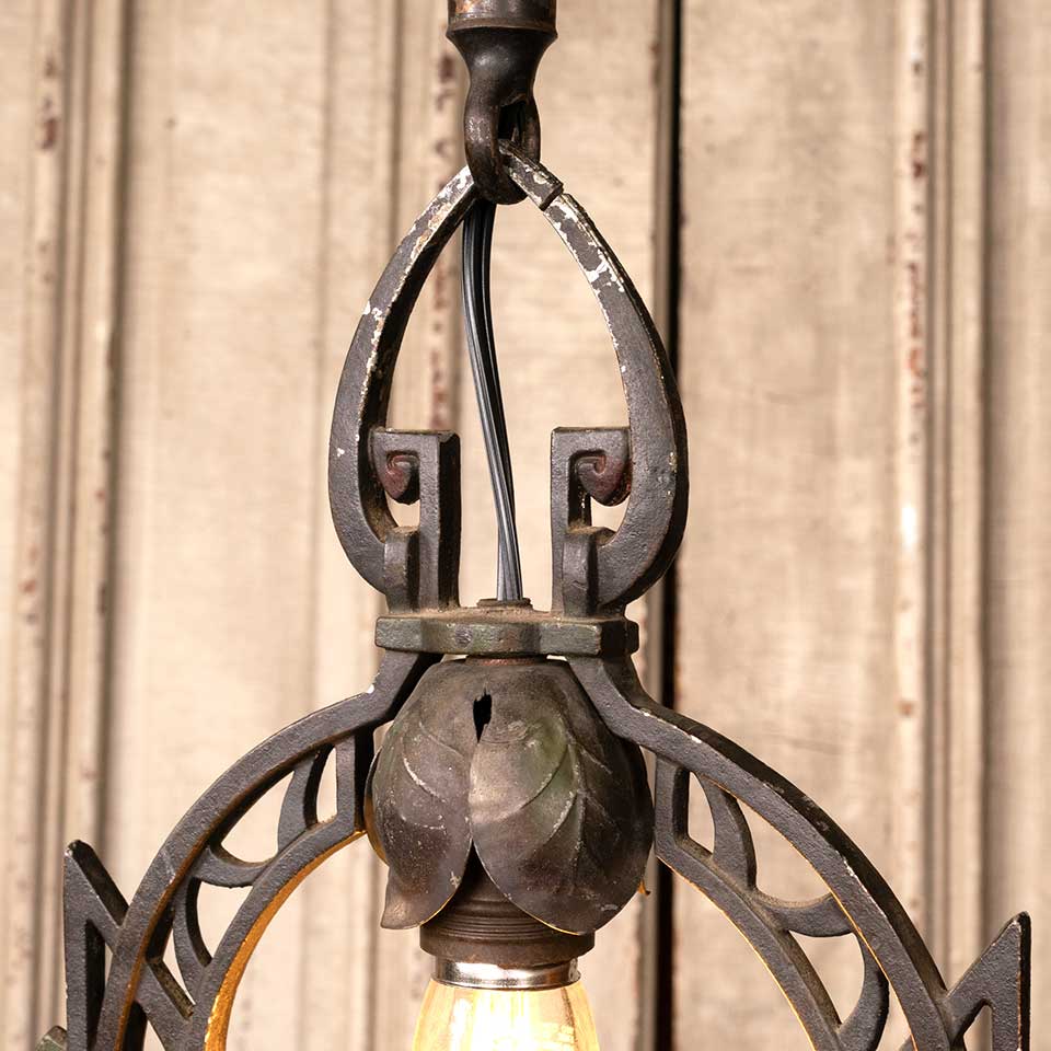 Architectural salvage antique Art Deco pendant light fixture measuring approx. measuring approx. 8 3/4" wide x 21" tall x 2 1/4" front to back. See photos to evaluate condition. Salvaged lighting should be inspected by a licensed electrician prior to installation.