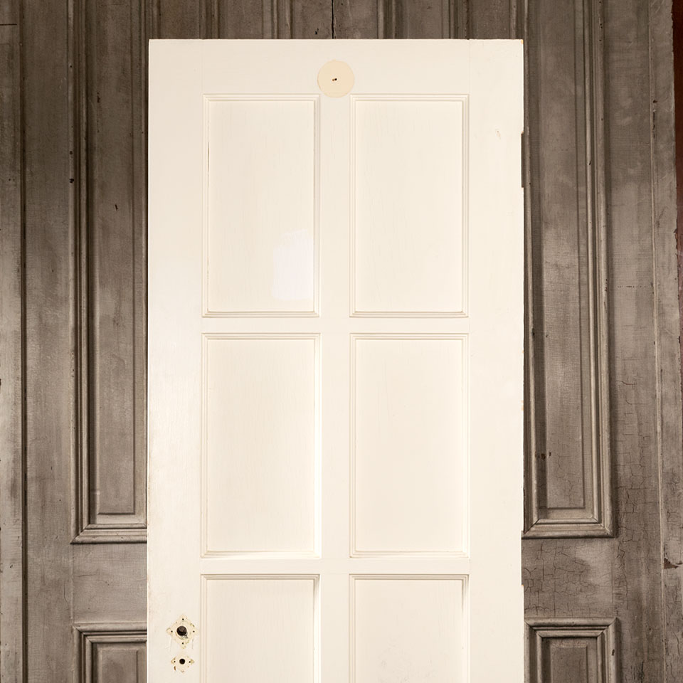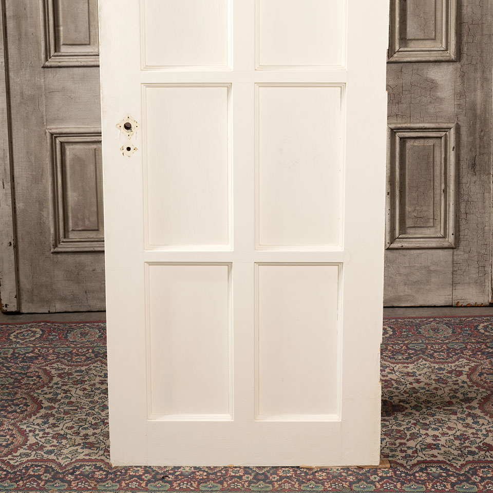 Vintage architectural salvage eight panel painted wood interior door measuring approximately 27 7/8" wide x 79 1/4" tall x 1 3/4" thick.