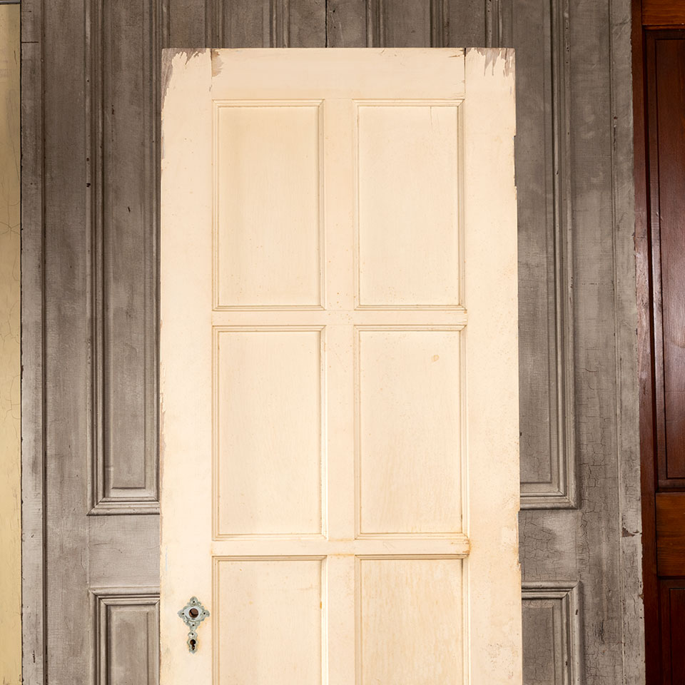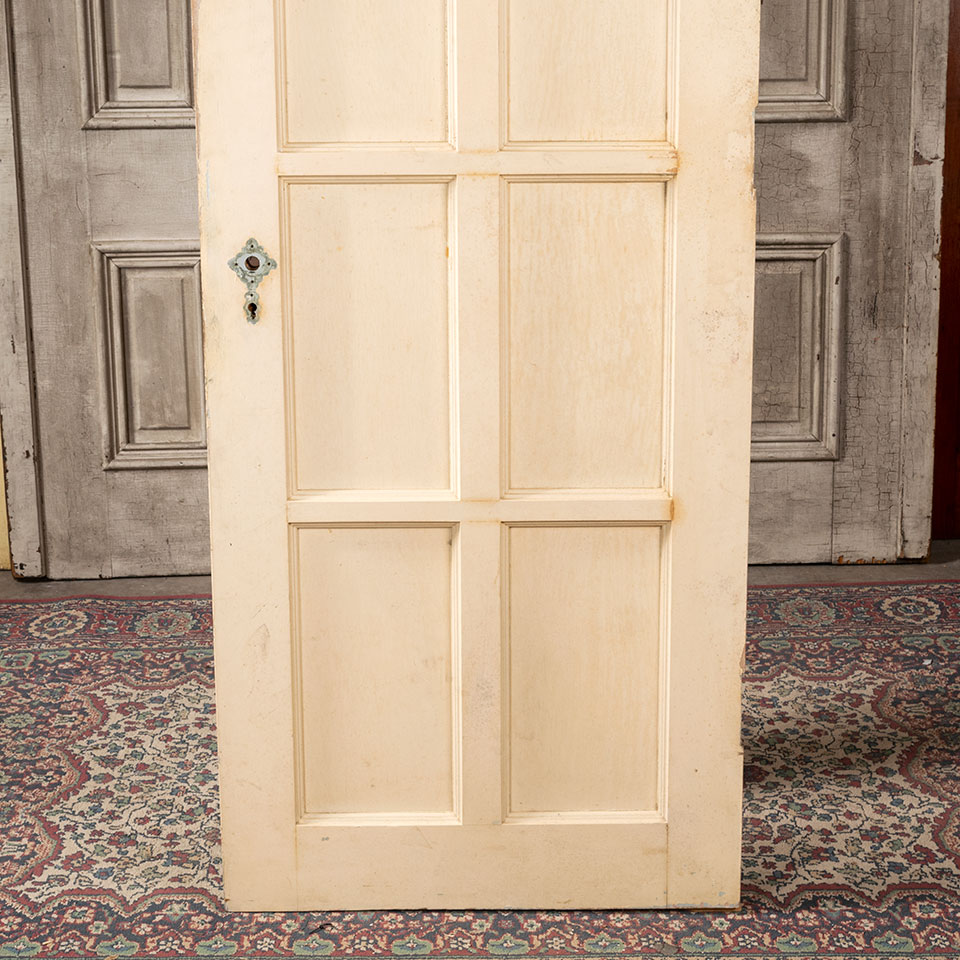 Vintage architectural salvage eight panel painted wood interior door measuring approximately 27 15/16" wide x 79 1/8" tall x 1 3/4" thick. This door has some damage. See photos to evaluate condition.