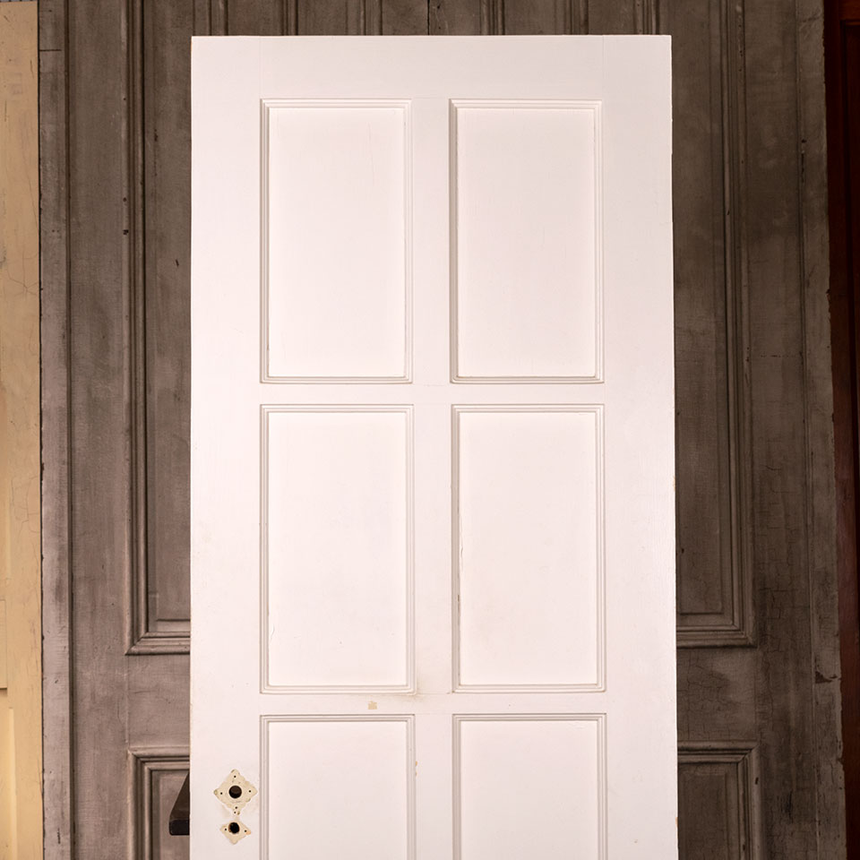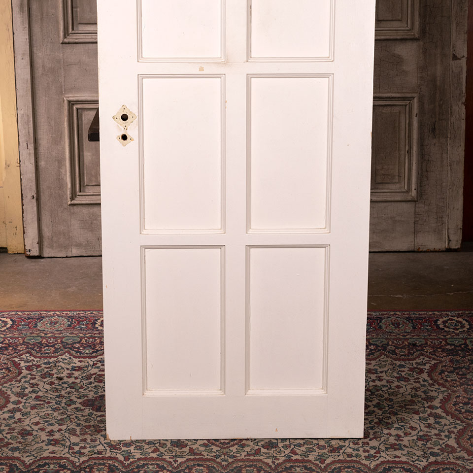Vintage antique architectural salvage eight panel interior painted wood door measuring approximately 27 15/16" wide x 78 1/2" tall x 1 3/4" thick.
