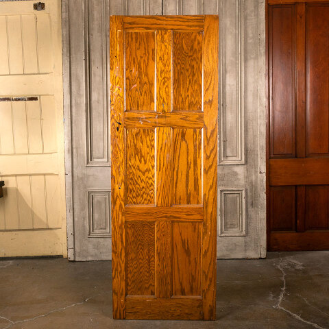 Antique architectural salvage 6 panel oak interior door with mirror on one side measuring approx. 27 3/4" wide x 79 5/8" tall x 1 3/4" thick. There is a loose piece of wood at the top of the mirrored side of the door. See photos to evaluate condition.