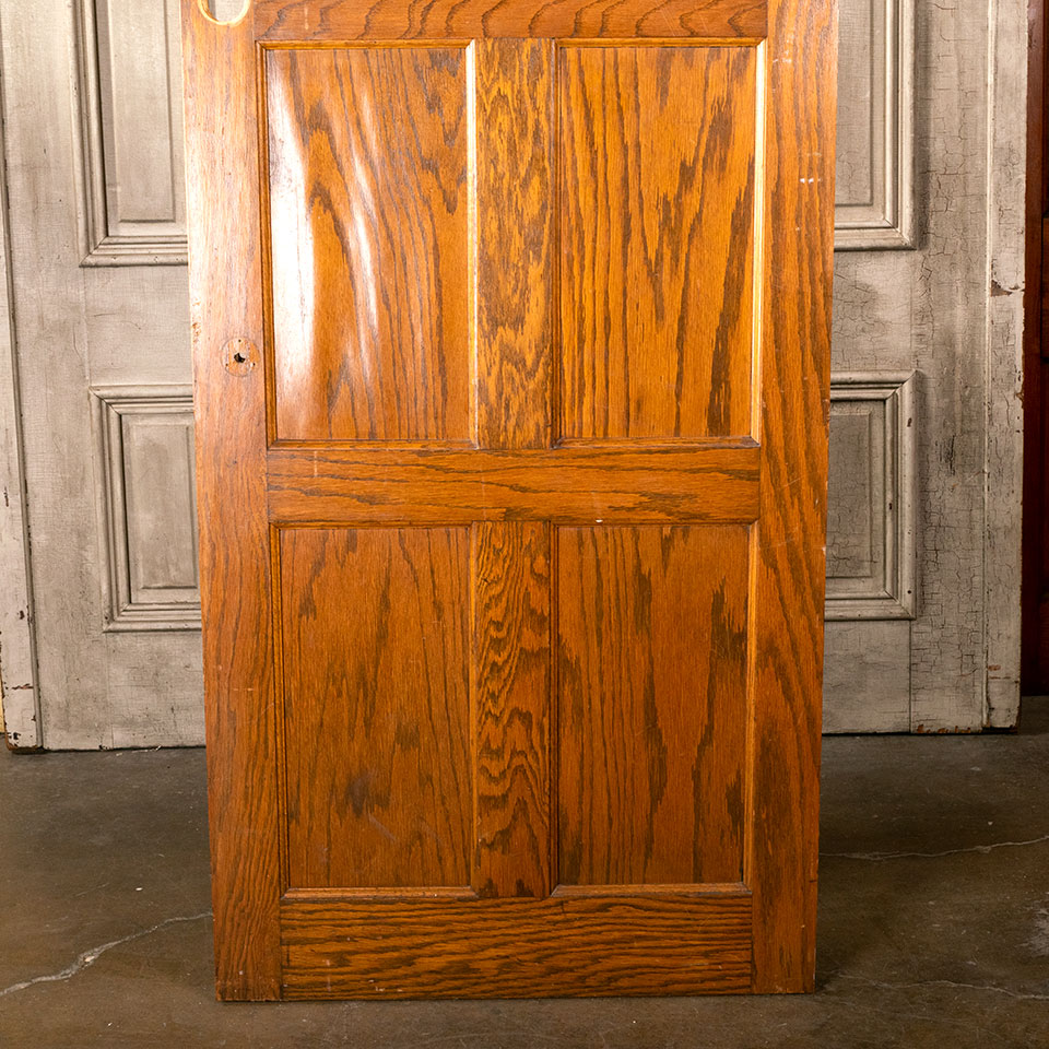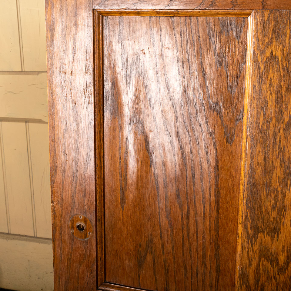 Antique architectural salvage 6 panel oak interior door measuring approx. 32 3/4" wide x 79 1/4" tall x 1 3/4" thick. The veneer on one of the middle panels on one side of the door is buckled. See photos to evaluate condition.
