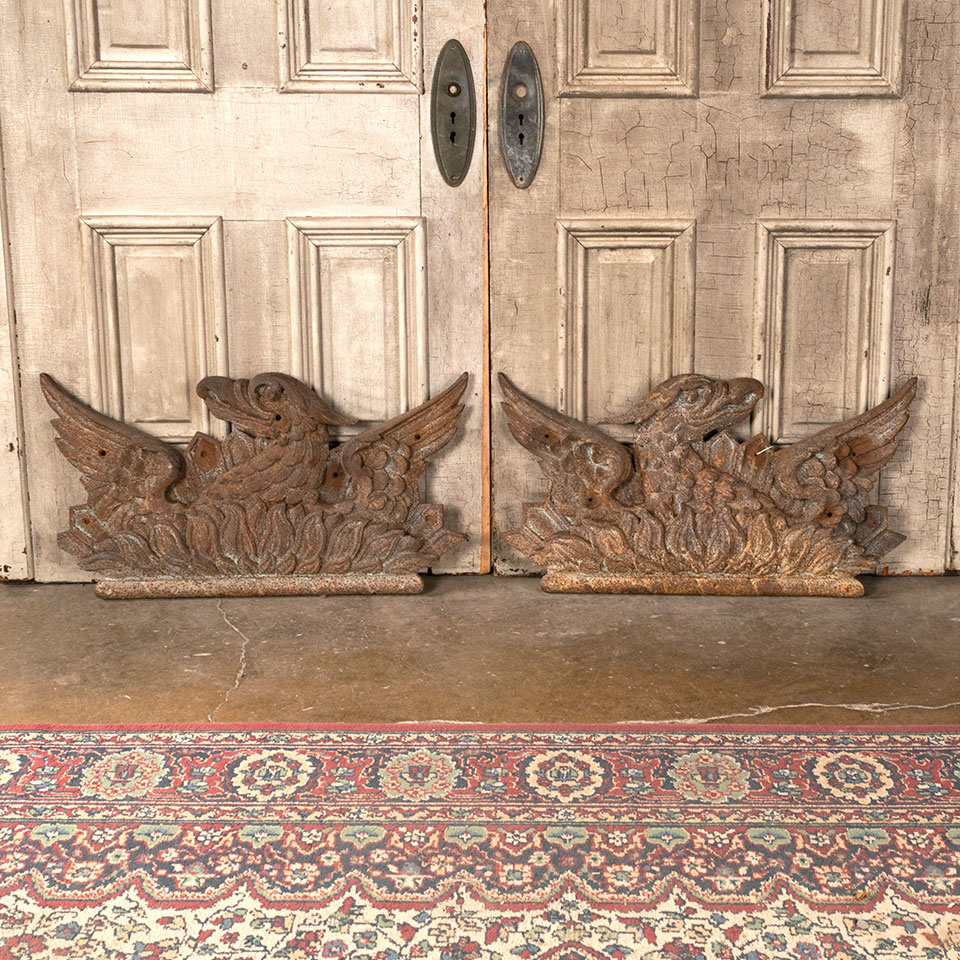Awesome pair of antique architectural salvage high relief cast iron mirror image surface mount building ornaments depicting the rebirth of Greek mythological phoenix birds rising from the fire each measuring approx. 30" wide x 16" tall x 2" front to back. See photos to evaluate condition. Priced at $5,500 for the pair.
