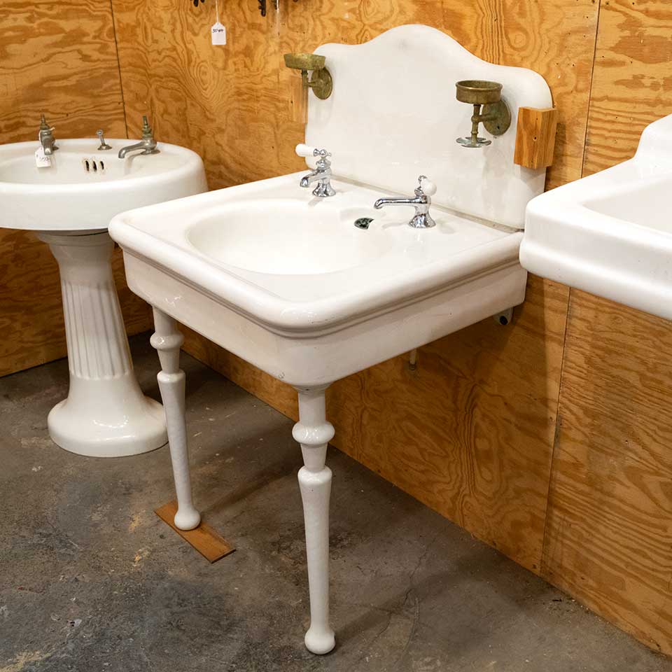 Architectural salvage antique porcelain bathroom sink and backsplash with cast iron porcelain enameled legs measuring approx. 27" wide x 43 7/8" tall x 22 1/2" front to back.