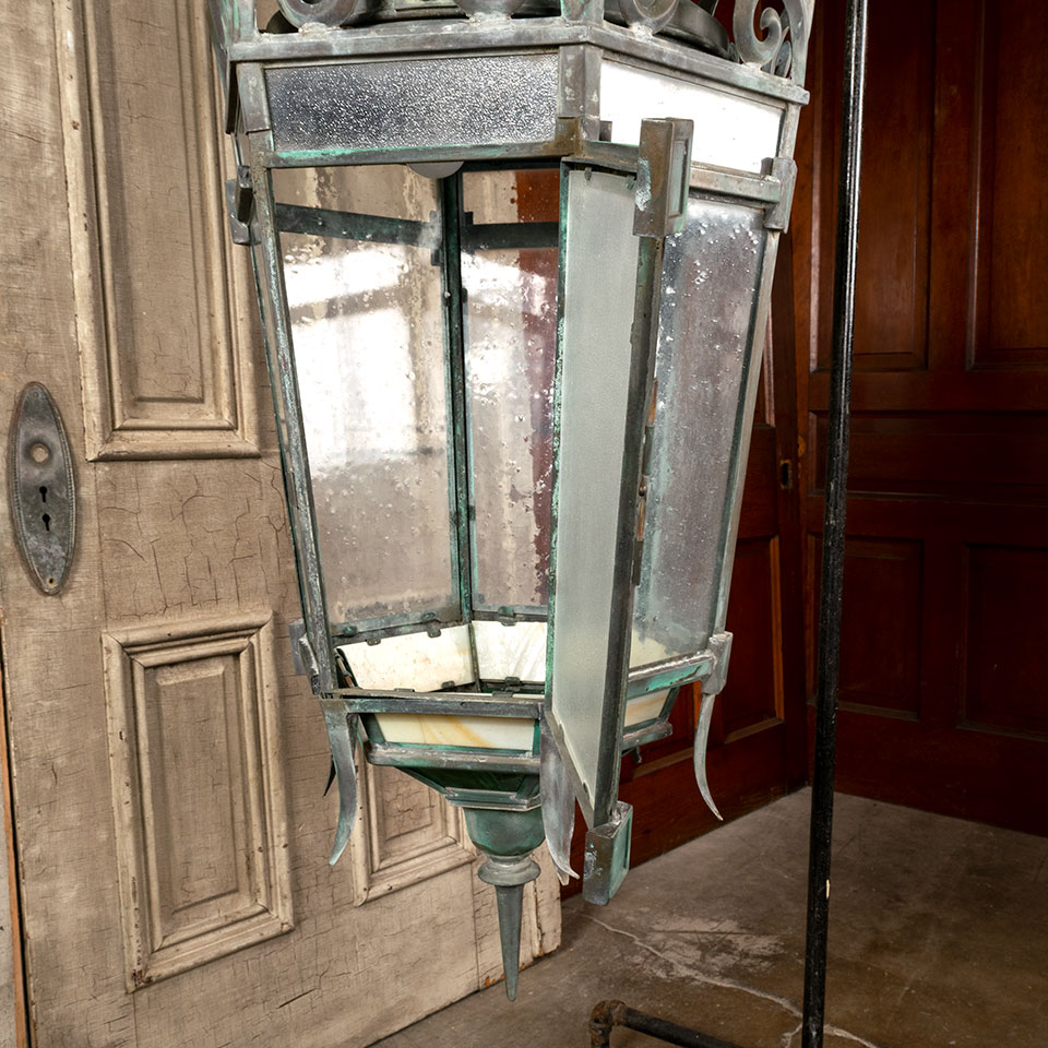 Antique architectural salvage large brass and glass Medieval Gothic Revival style fleur de lis exterior pendant lantern chandelier light fixture measuring approx. 24" in diameter x 48" tall (fixture only). See photos to evaluate condition. A licensed electrician should inspect the fixture and wiring prior to installation.
