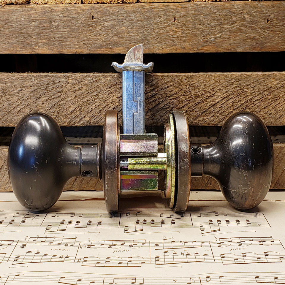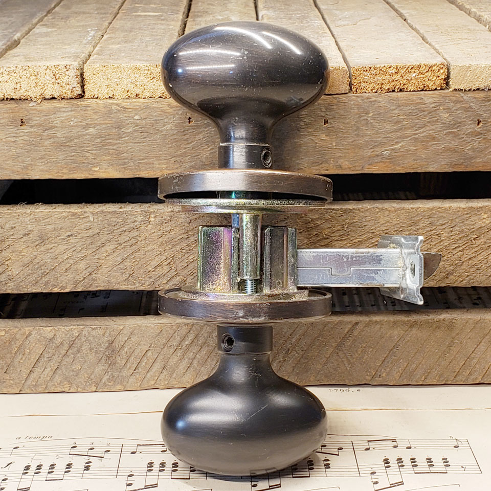 Salvaged solid brass reversible passage door hardware set with 1 1/2" x 2 1/2" oval knobs and 2 1/2" diameter rosettes with antique bronze finish. The latch is approximately 2 1/4" from spindle center. See photos to evaluate condition. Used item.