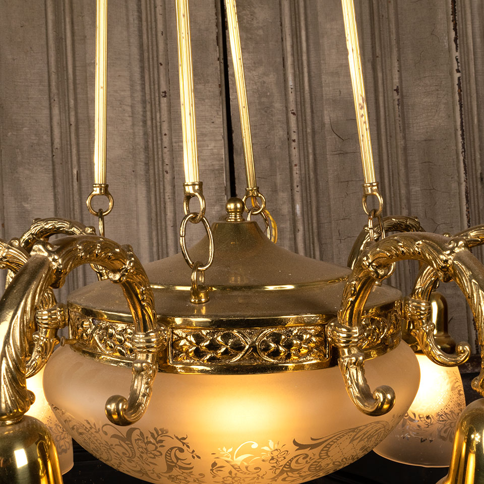 Architectural salvage reproduction 8 light brass chandelier measuring approx. 25" in diameter x 55" tall. The upright rods have some bending in them. See photos to evaluate condition.