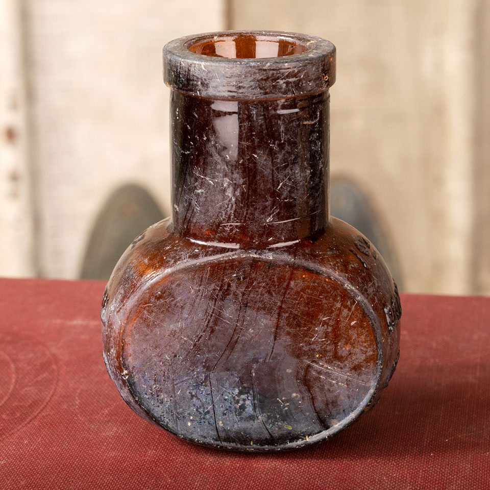 Small antique amber glass Bovril Limited bottle measuring approximately 2" x 2 11/16" x 1 1/8" with a 3/4" diameter mouth opening.